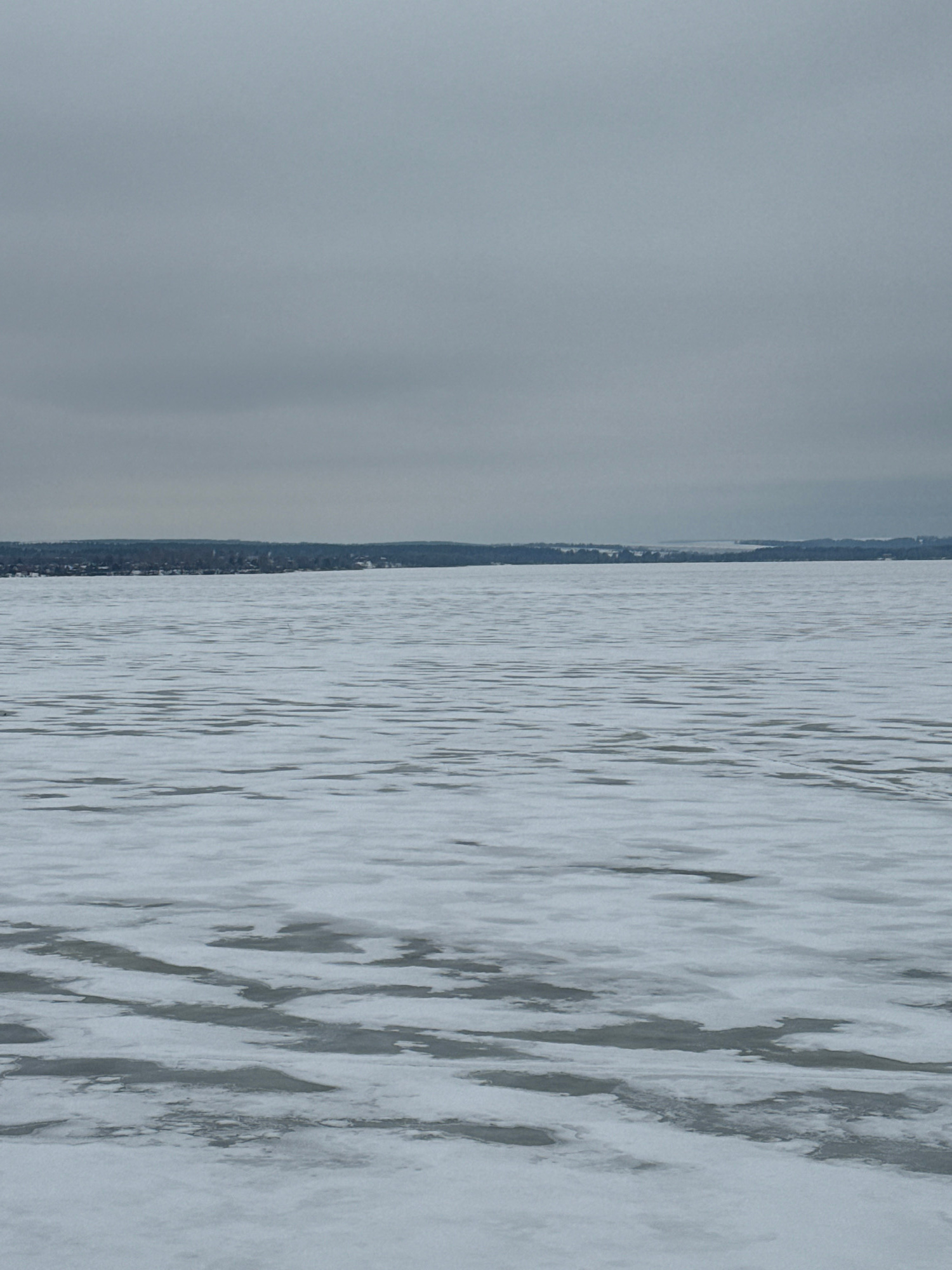 The image depicts a body of water, likely a river or lake, in the city of Votkinsk, Russia. The water's surface shows ripples and wave patterns, suggesting some movement. On the left side of the image, there is a bank or shoreline with dense vegetation and possibly some buildings visible in the distance. The sky is overcast, creating a diffused, grey light, and visibility appears limited. | Open Wire