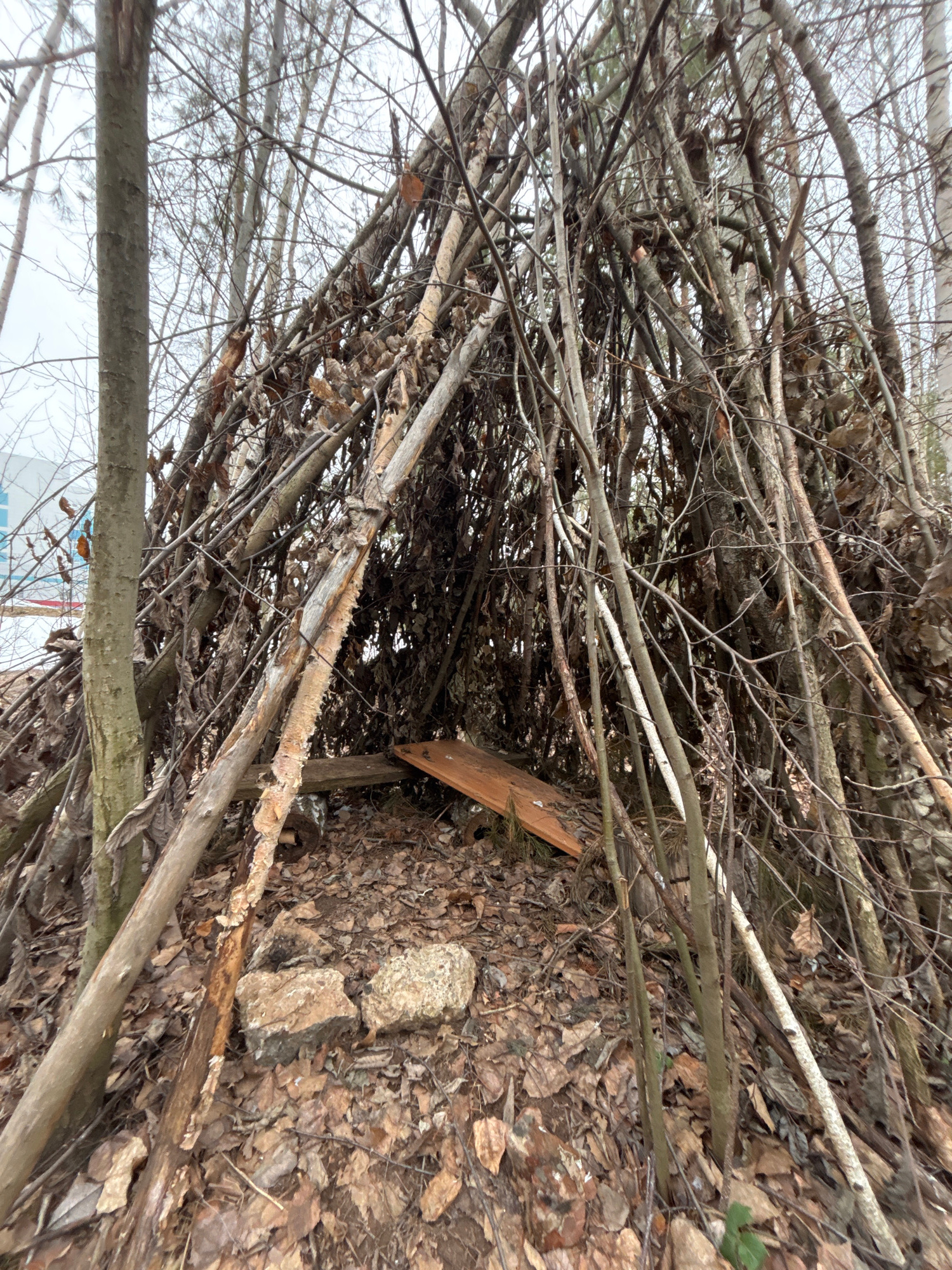 The image depicts a dense accumulation of fallen branches and leaves, creating a makeshift shelter-like structure. A piece of wood appears to be incorporated into the structure. The surrounding ground…read more