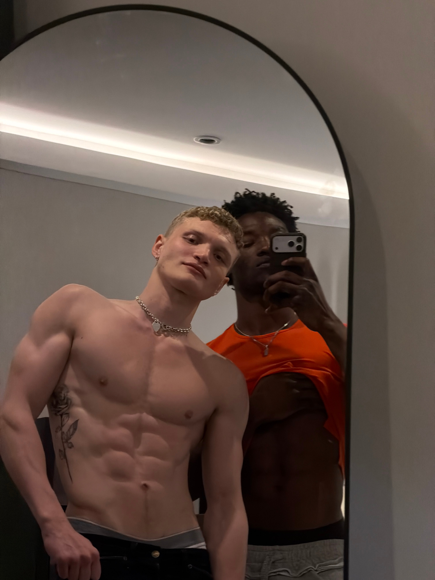 The image shows a selfie in a mirror. In the foreground, a shirtless, muscular white man with short blonde hair and a silver chain poses. A rose tattoo is visible on his torso. Behind him, an African-…read more