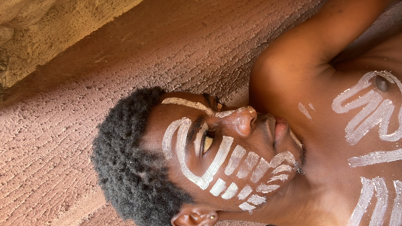 A close-up portrait features a dark-skinned person, possibly male, lying or reclining. The individual's head is positioned to the left, with their eyes closed or cast downwards, conveying a calm or in…read more