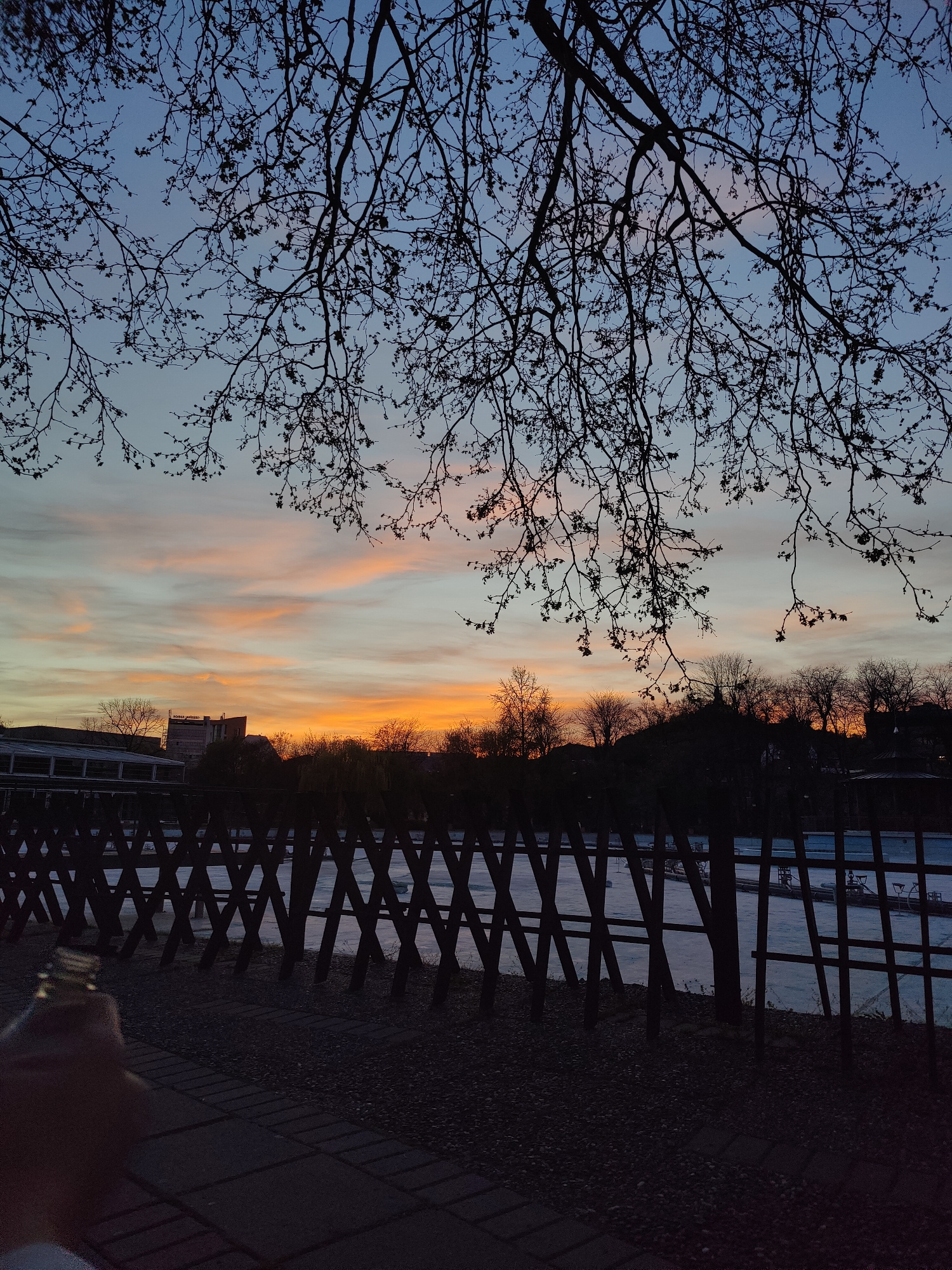 The image is taken at dusk or dawn, with a view overlooking a fence toward a body of water, likely the Rowing Canal in Plovdiv, Bulgaria. The sky features a gradient of colors, transitioning from blue…read more