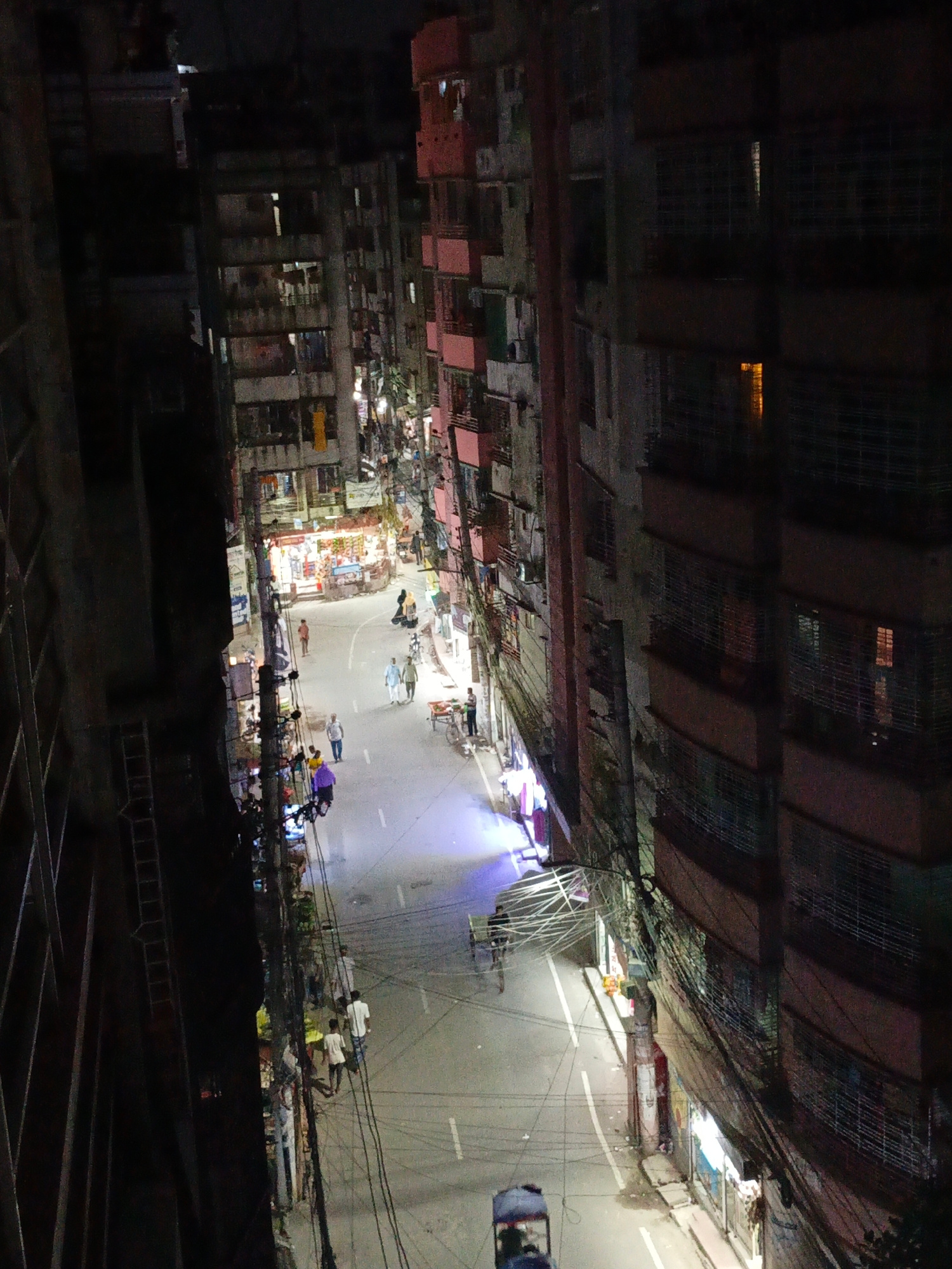 A high-angle, nighttime view down a street in Dhaka, Bangladesh. The street is lined with tall buildings on both sides, some with balconies. Many people are walking and some are standing on the streetβ¦read more