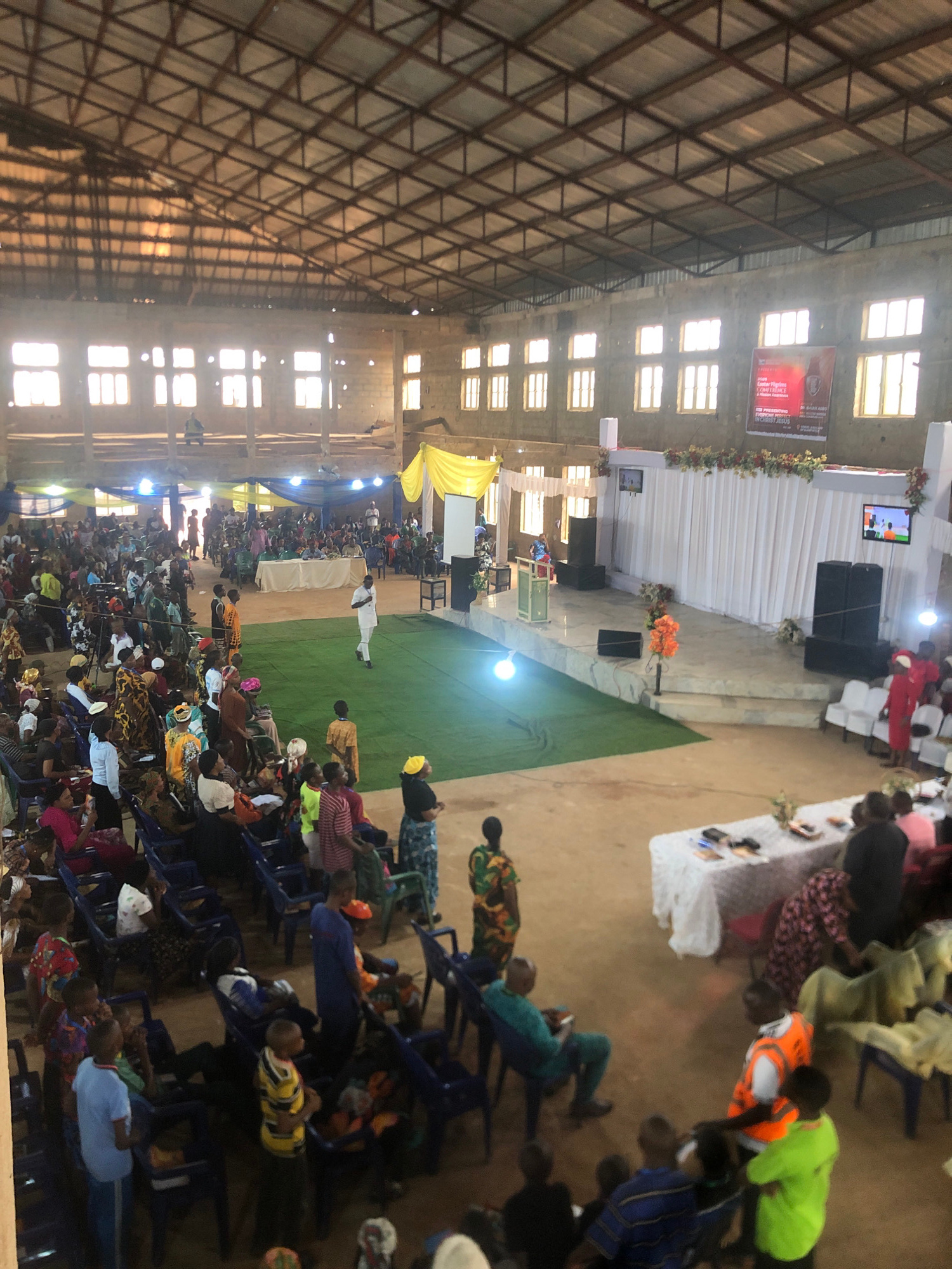 The image shows a large indoor space filled with people seated in rows of blue plastic chairs. The setting appears to be a church or auditorium, as indicated by a stage area with white drapery, floral…read more