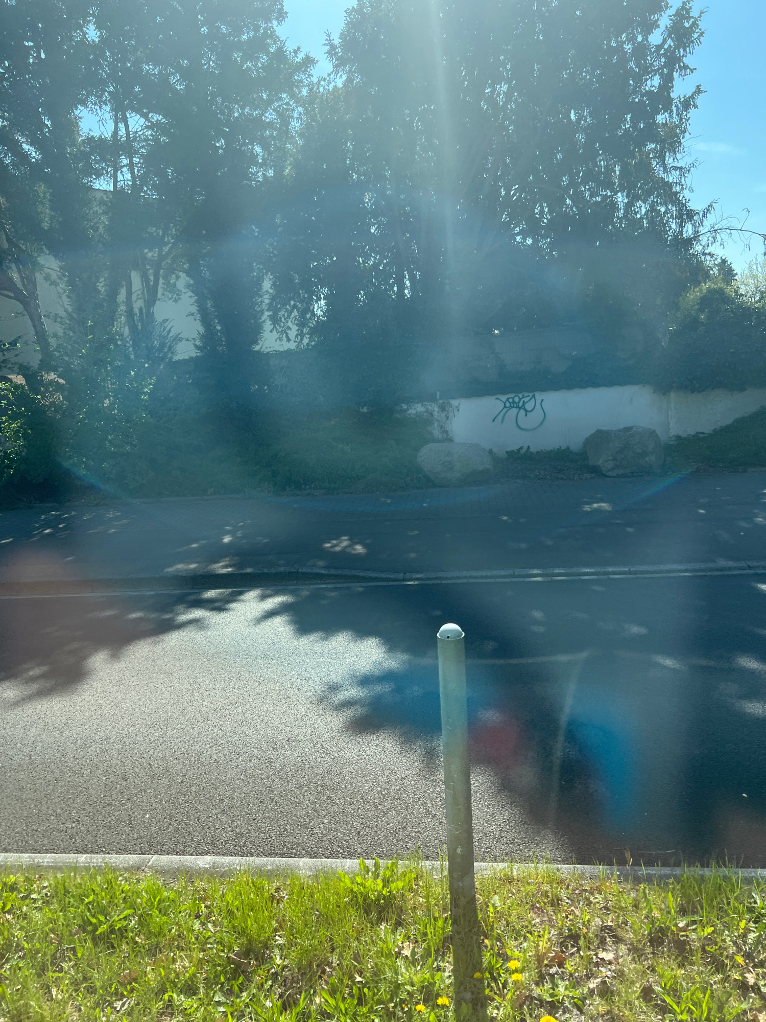 The image shows a street view taken through a window. On the right, there is a paved road with a grassy area adjacent to it. A gray metal pole stands near the road edge. To the left, there is a tree l…read more