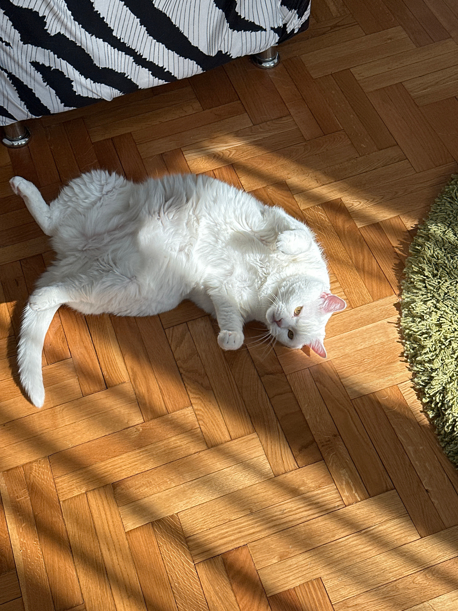 A white cat is lying on its back on a parquet wood floor in a well-lit room. The cat is positioned in the center of the frame, with its paws in the air and its tail extended. The cat has yellow eyes.…read more