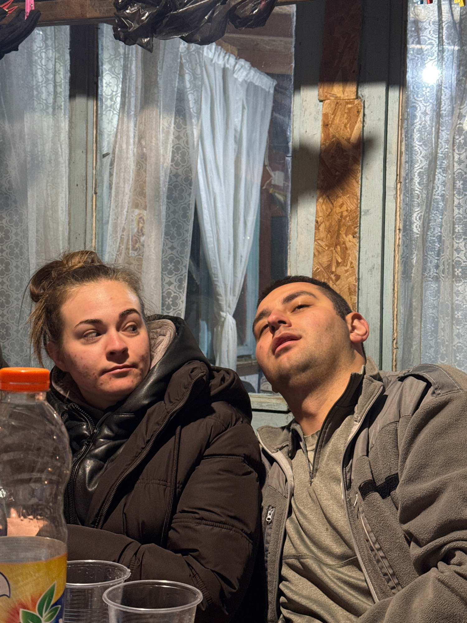 Two individuals, a male and a female, are indoors. The male is wearing a gray jacket. The female is wearing a dark jacket. The background includes a window covered with patterned curtains and a sectio…read more