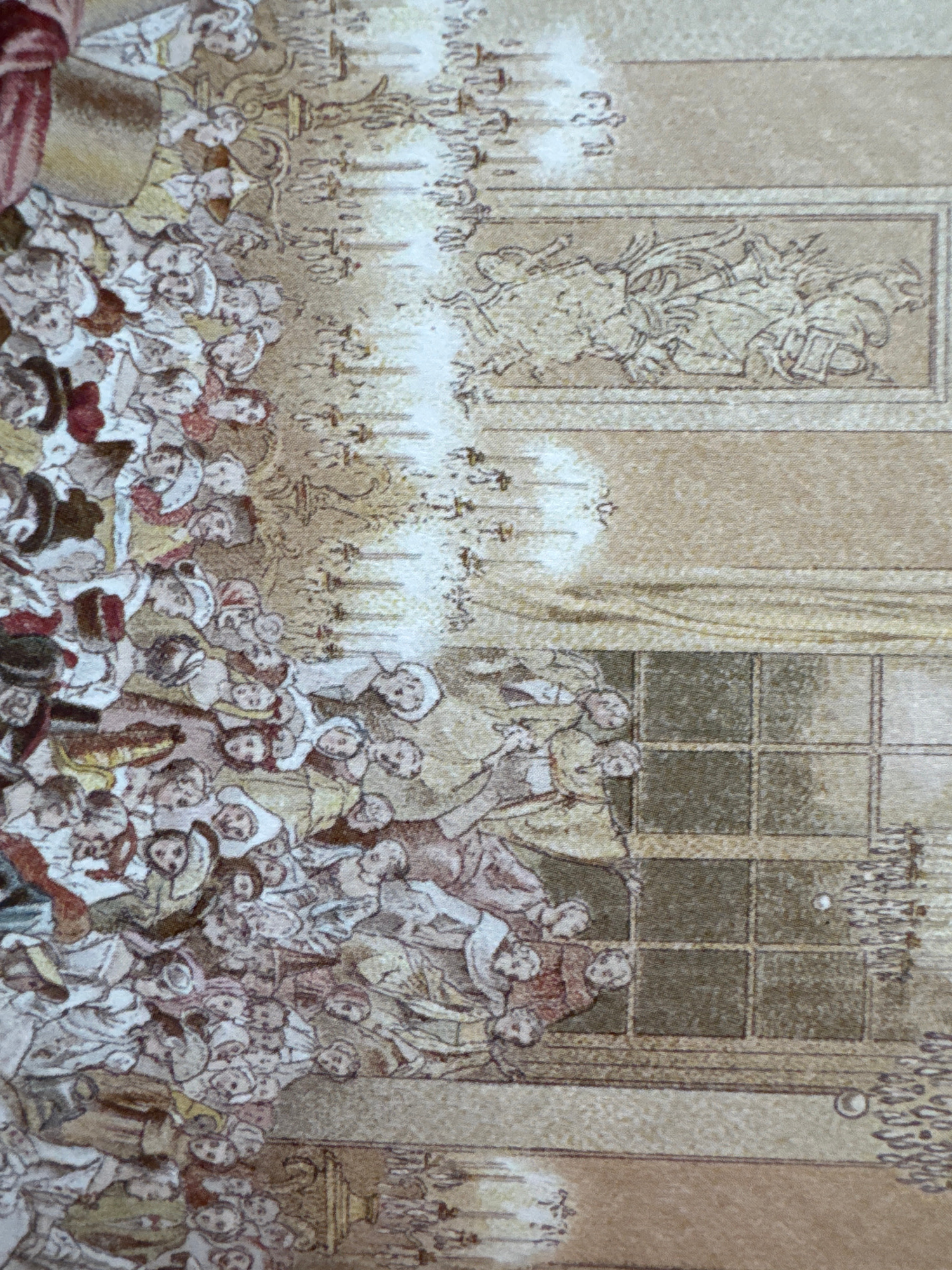 A scene depicting a large crowd gathered indoors, seemingly at a formal event or ball. Individuals are dressed in attire resembling historical European fashion, including elaborate hats, dresses, andβ¦read more