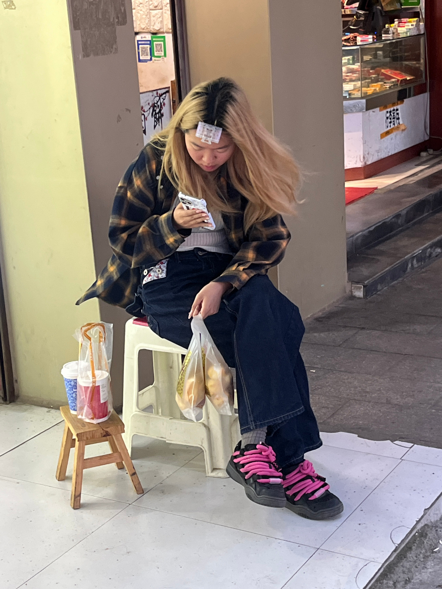 A medium eye-level shot shows a female seated on a white plastic chair, facing left and slightly angled towards the camera, holding a phone with her left hand and an item in her right hand. She wears…read more