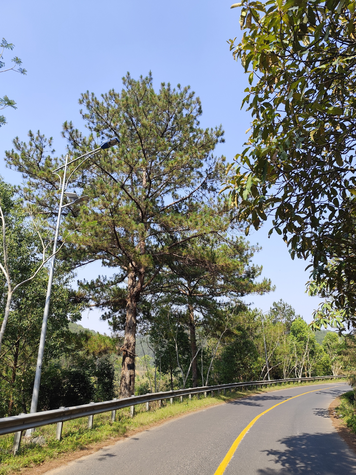 The image depicts a road in Da Lat, Vietnam, curving to the right. A yellow line marks the road's center. A metal guardrail lines the left side of the road. Various trees flank the road, with a large…read more