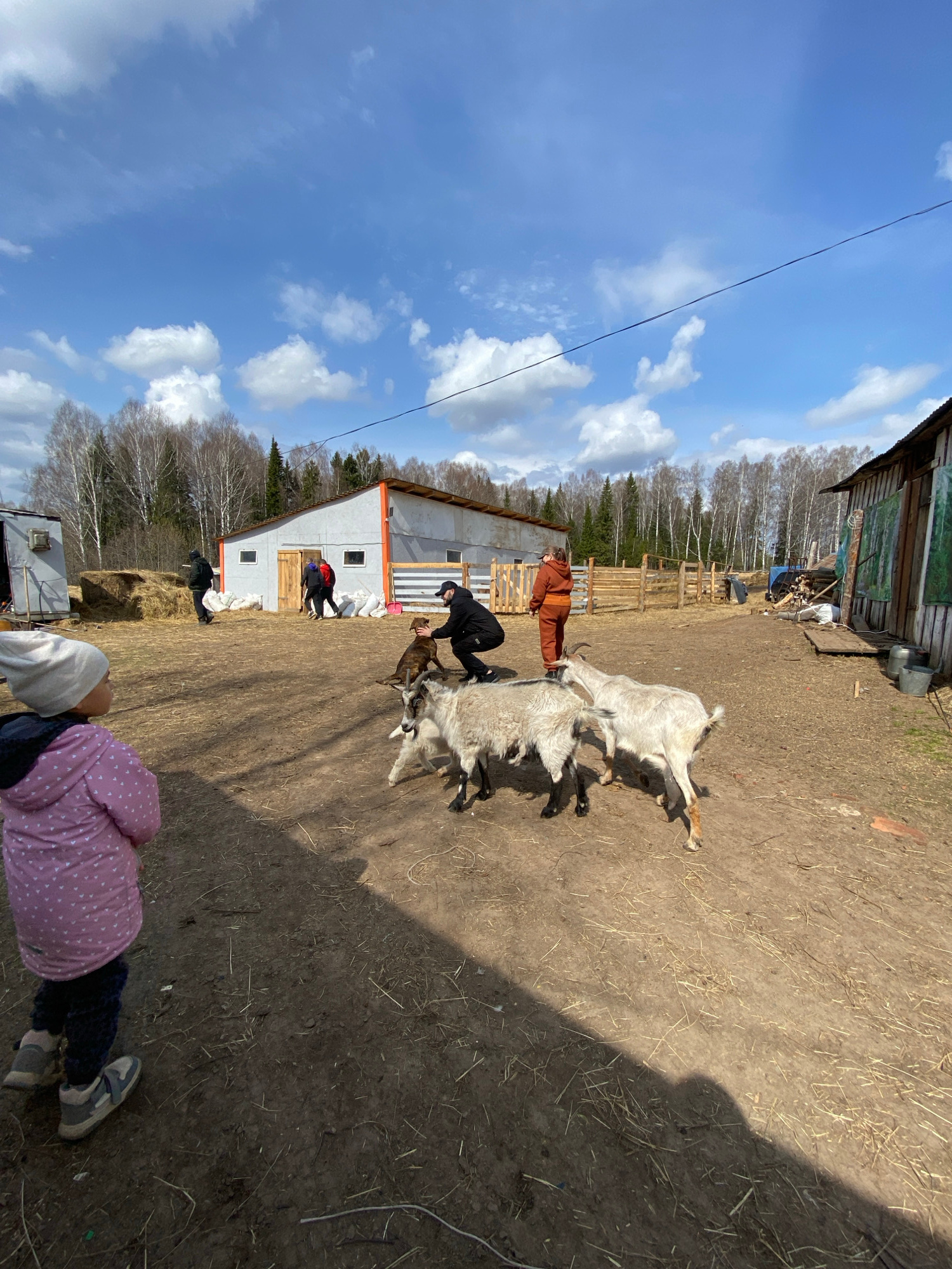 The image depicts an outdoor scene in Zhigalki, Russia, on a sunny day with a partly cloudy sky. The environment appears to be a rural farm or homestead. There are several goats grouped together, with…read more