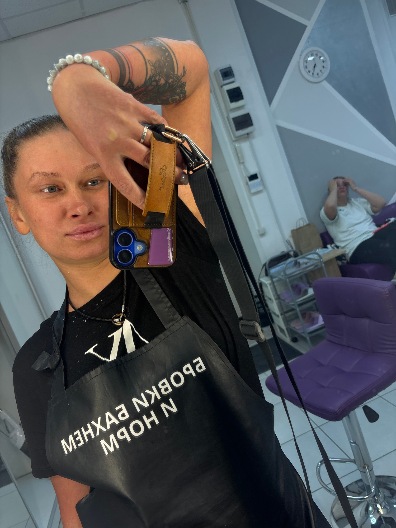 The image is a mirror selfie taken indoors in what appears to be a salon or professional studio in Perm, Russia. The main subject is a woman taking the selfie, looking directly into the camera/mirror.…read more