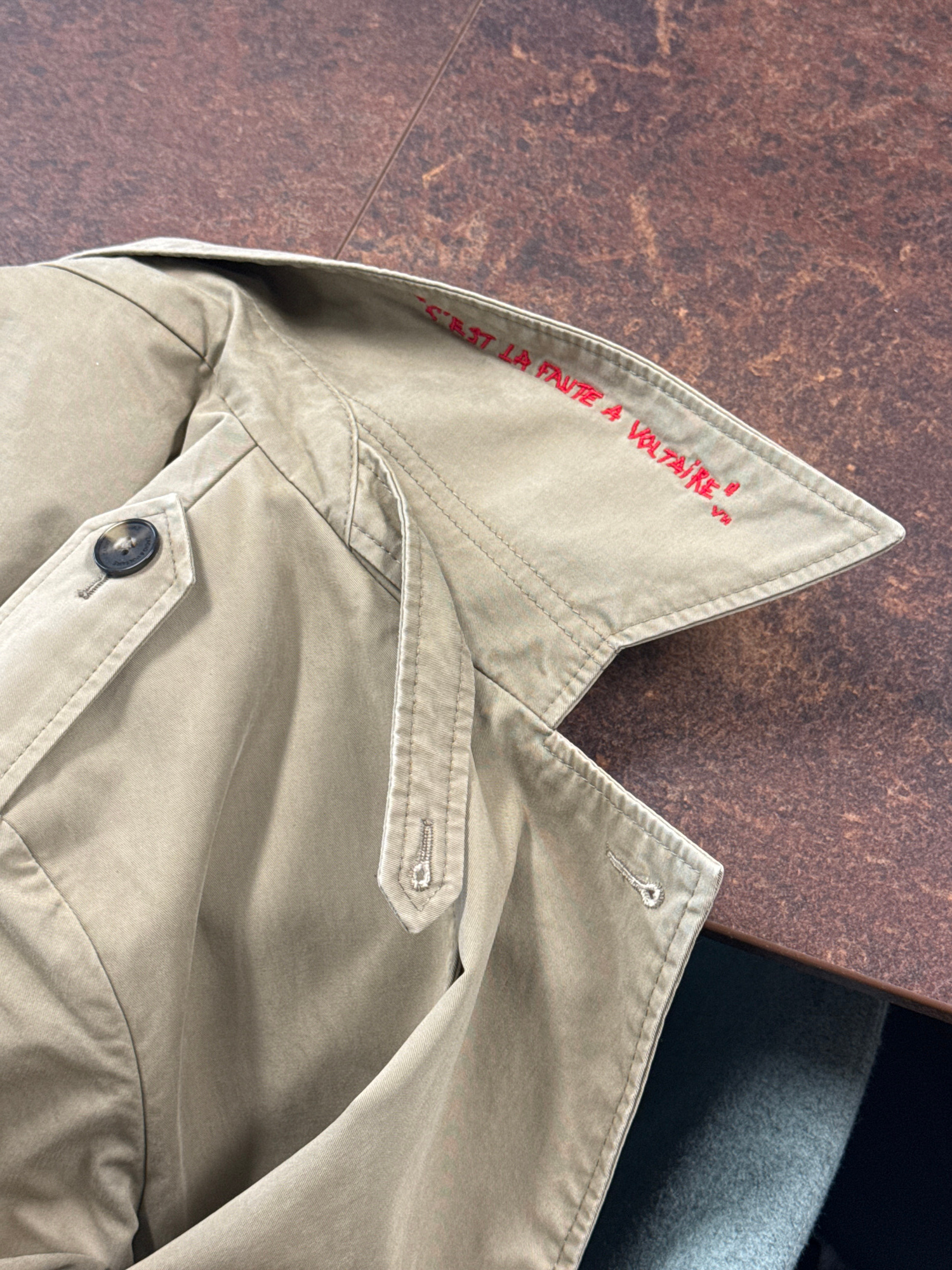 The image shows a close-up of a tan or khaki-colored trench coat. A red inscription is visible on the collar, reading "C'EST LA FAUTE A VOLTAIRE!". The coat features button detailing, including a butt…read more