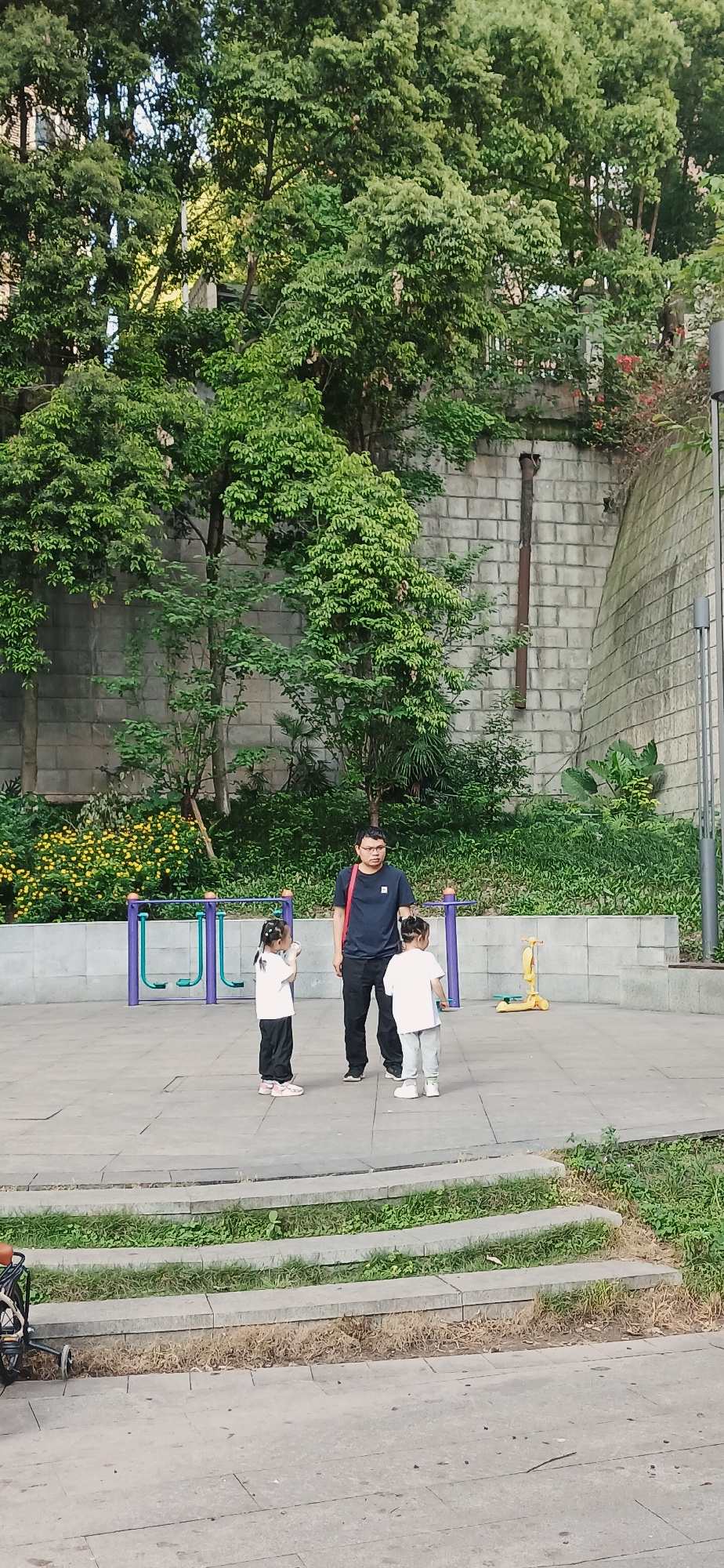 The image depicts a scene in a park in Jiulongpo District, China. An adult and two children are standing on a paved path. The adult is wearing a dark shirt, black pants, and glasses. One child is wear…read more