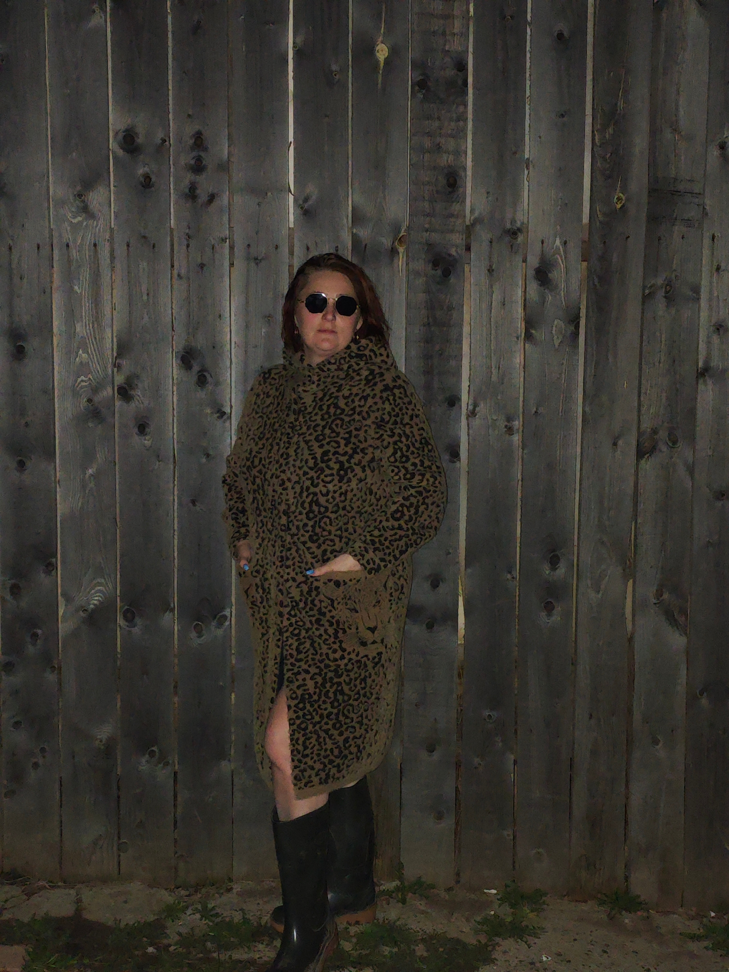 A person stands in front of a wooden fence. The person wears dark glasses, a long leopard-print coat, and tall black boots. The location appears to be outdoors at night. The ground is visible in the l…read more