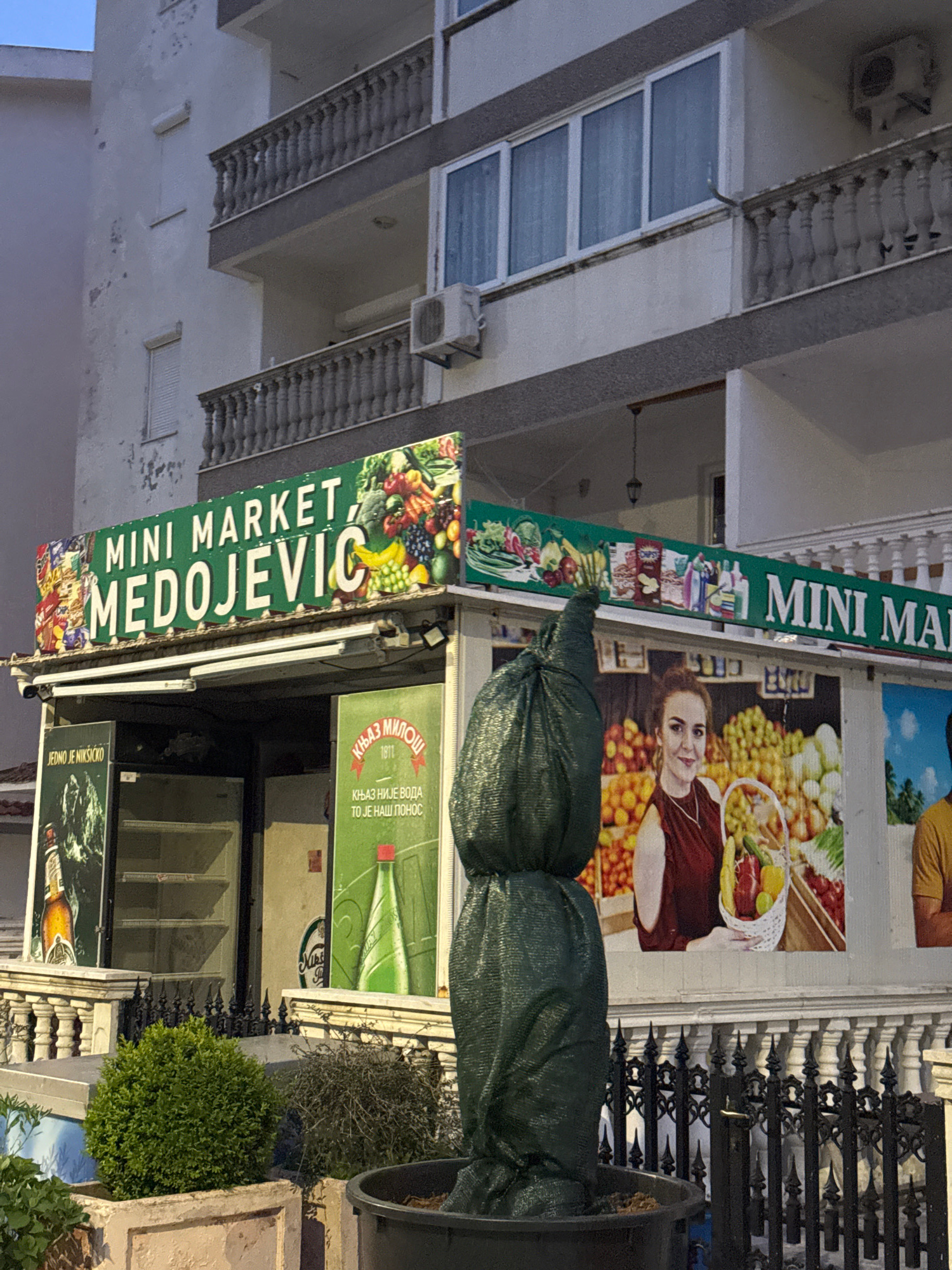 The image shows a storefront in Sutomore, Montenegro, displaying the signs "MINI MARKET MEDOJEVIC" and "MINI MA". The "MINI MARKET" sign features images of fruits and vegetables. Two large advertiseme…read more