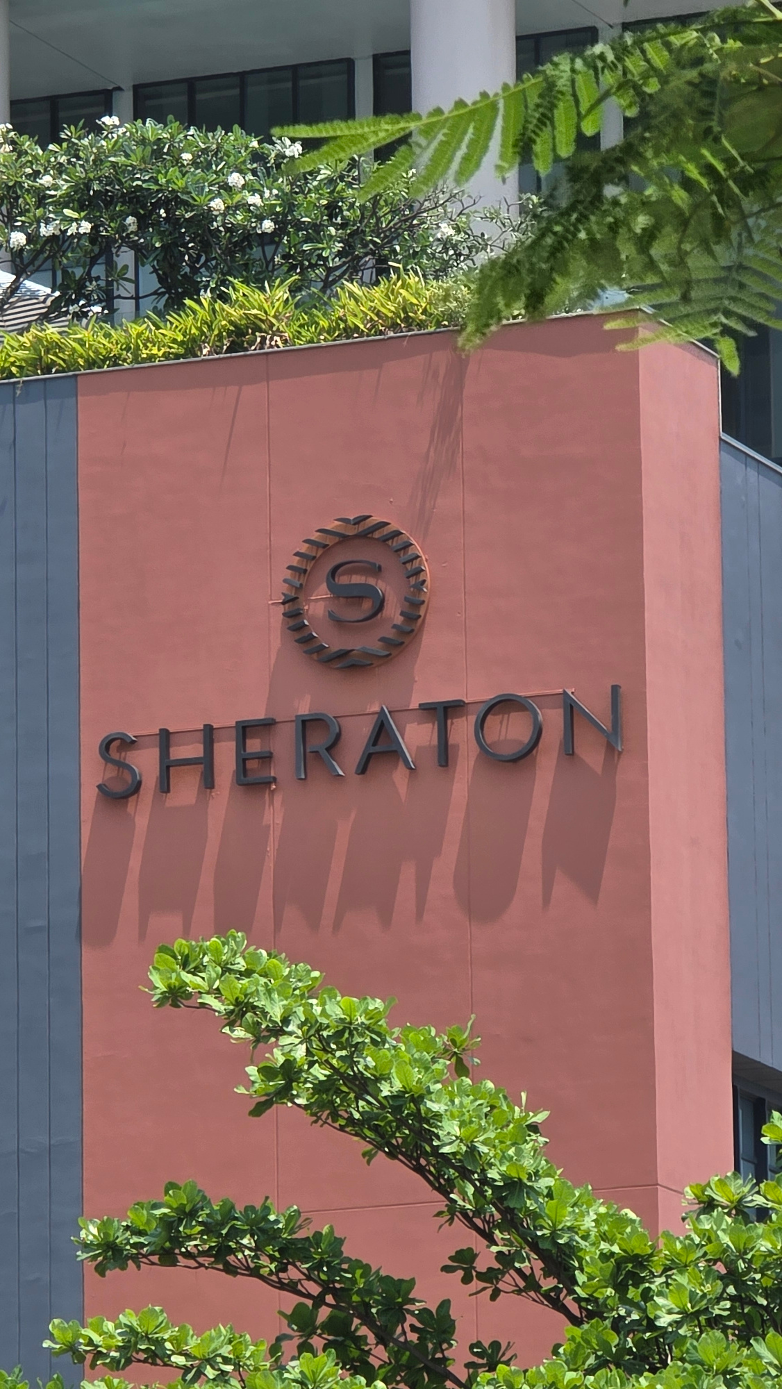 The image depicts the Sheraton Nha Trang Hotel in Nha Trang, Vietnam. The building's facade is prominently displayed, with the hotel's name and logo. Lush green foliage partially obscures the view.