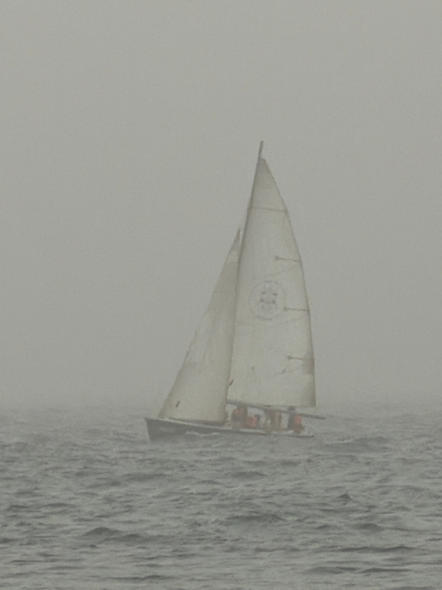 The image shows a sailboat navigating through dense fog or mist, seen from a distance on choppy, grey water. The background is an expansive, featureless light grey, indicating extremely low visibility…read more