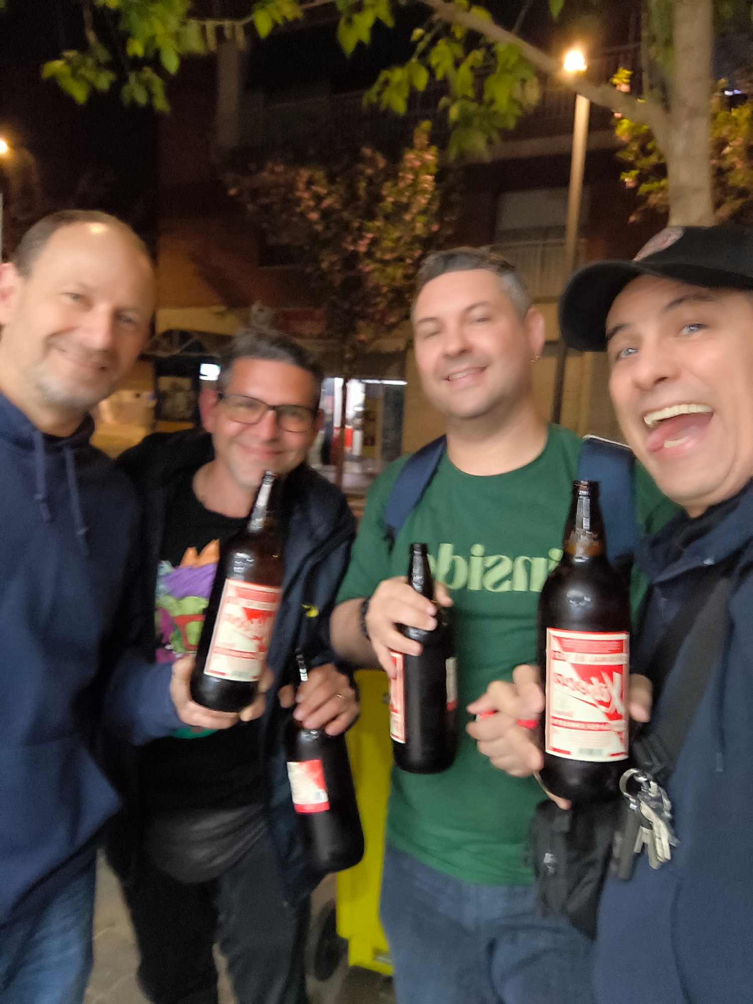 Four men are in an outdoor setting, likely in Ripollet, Spain. Each of them is holding a bottle of what appears to be beer. The bottle labels have red and white markings with distinct lettering. They…read more
