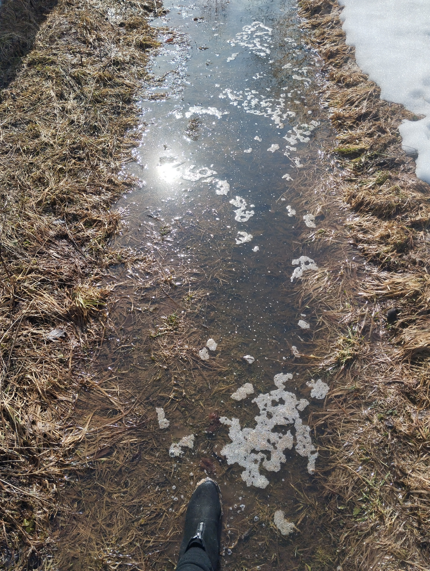 The image depicts a waterlogged path in a rural or undeveloped area, possibly in early spring. The path is lined with dead, brown grasses and reeds. Patches of melting snow are visible on the right si…read more