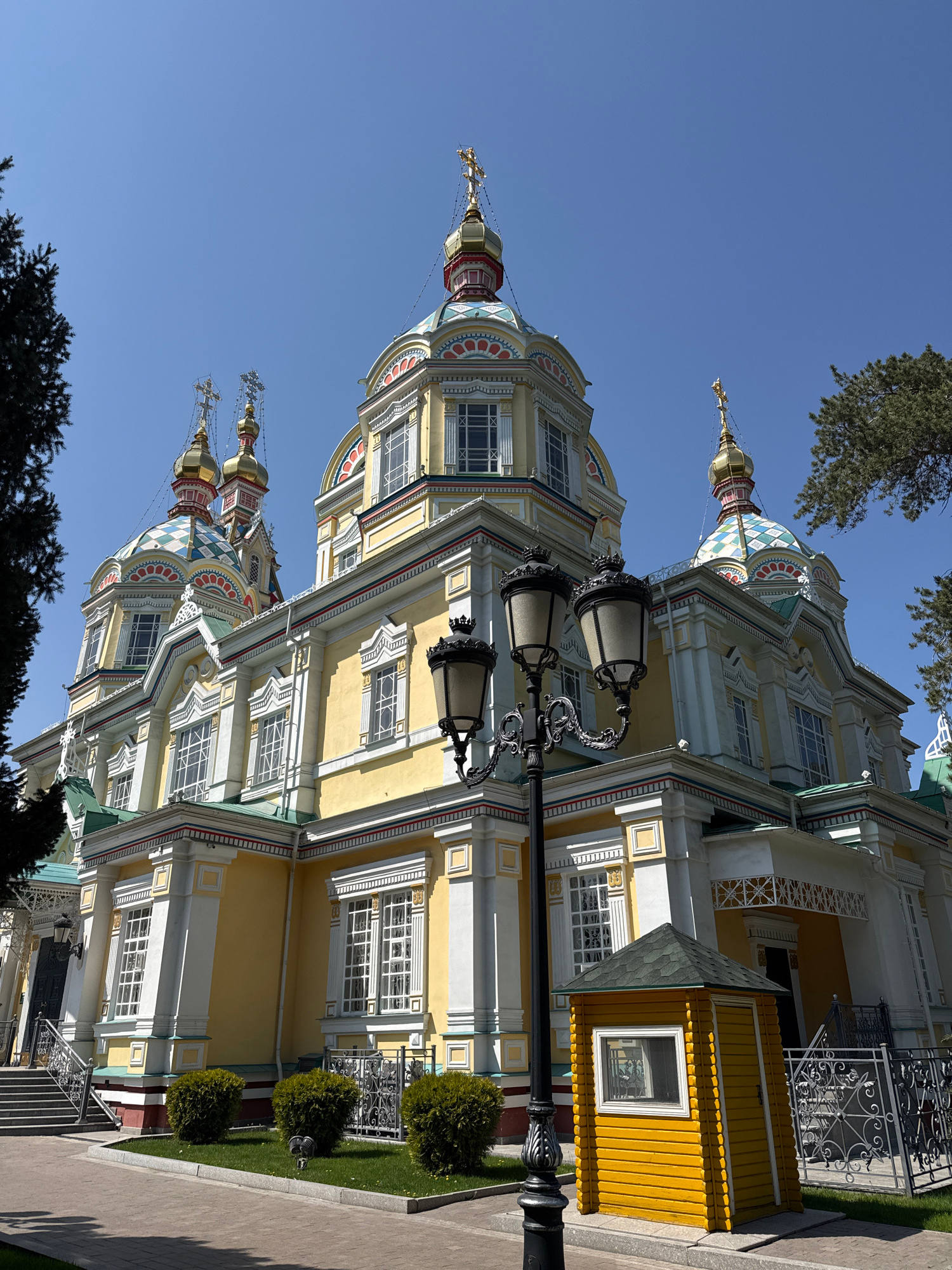 The image captures the Ascension Cathedral, located in Almaty, Kazakhstan. The structure is a predominantly yellow building with white accents and intricate detailing around the windows and cornices.…read more