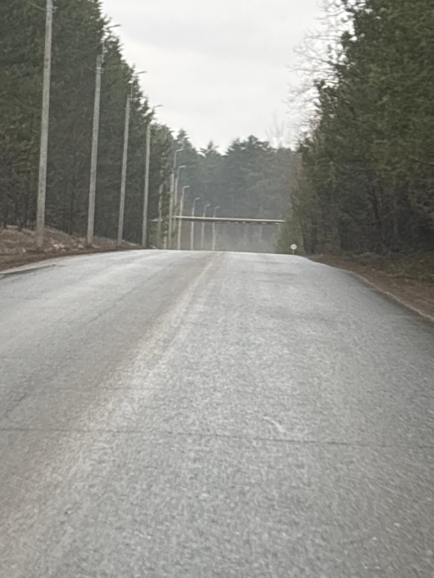 The image depicts a paved road leading into a forest. The road surface appears wet or recently rained on. To the left of the road is a series of closely spaced, horizontal concrete barriers or support…read more