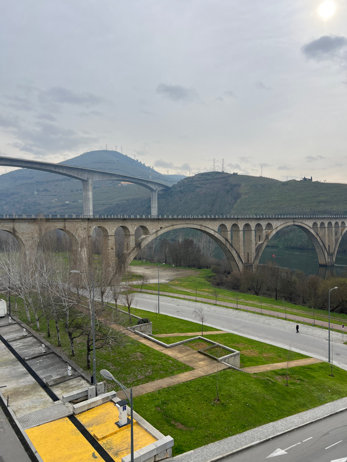 The image captures an expansive, high-angle view of the city of Peso da Régua, Portugal, primarily featuring the Douro River and its crossing infrastructure under an overcast sky. In the midground, t…read more