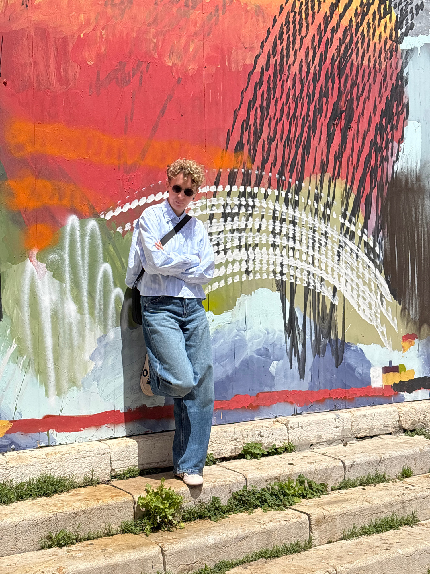 A person is lying on a colorful painted wall next to stone steps with plants growing in the cracks. The person has fair skin and curly, blonde hair and is wearing sunglasses, a long-sleeved blue-and-w…read more
