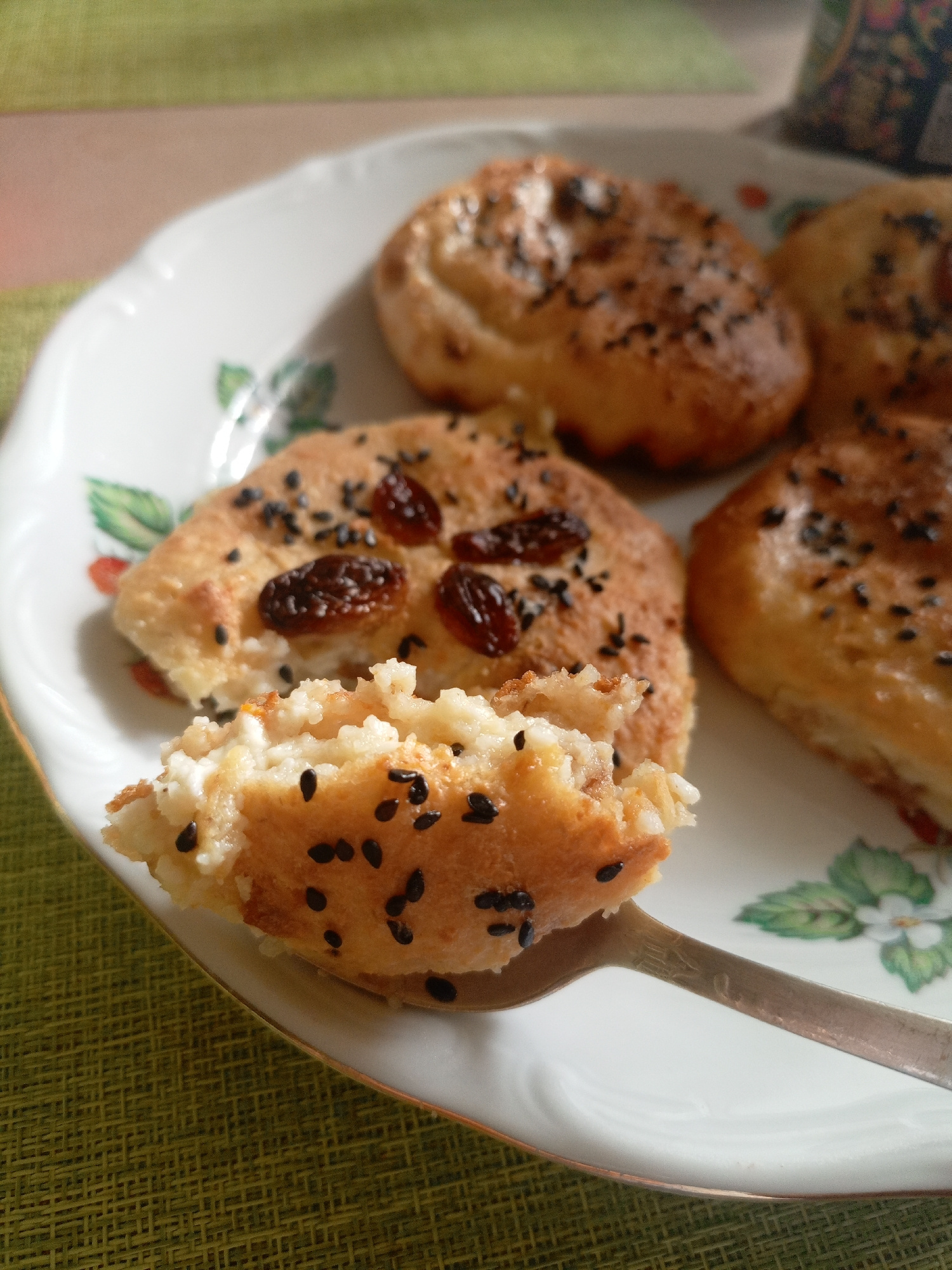 A close-up shows a white porcelain plate holding four baked goods sprinkled with black seeds. One is broken and on a spoon. The plate features a floral design with red berries, green leaves, and whiteβ¦read more