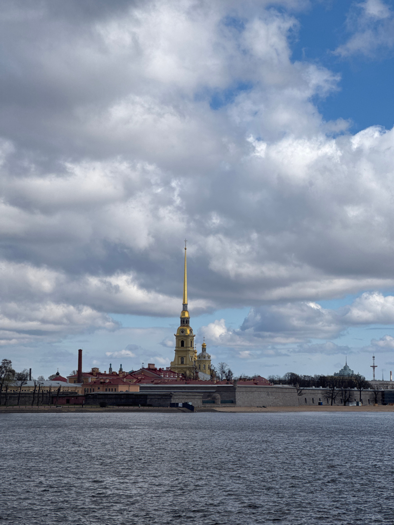 The image, oriented vertically, captures a panoramic view of the Neva River embankment in Saint Petersburg, Russia, with the iconic Peter and Paul Fortress in the distance. The most prominent subject…read more