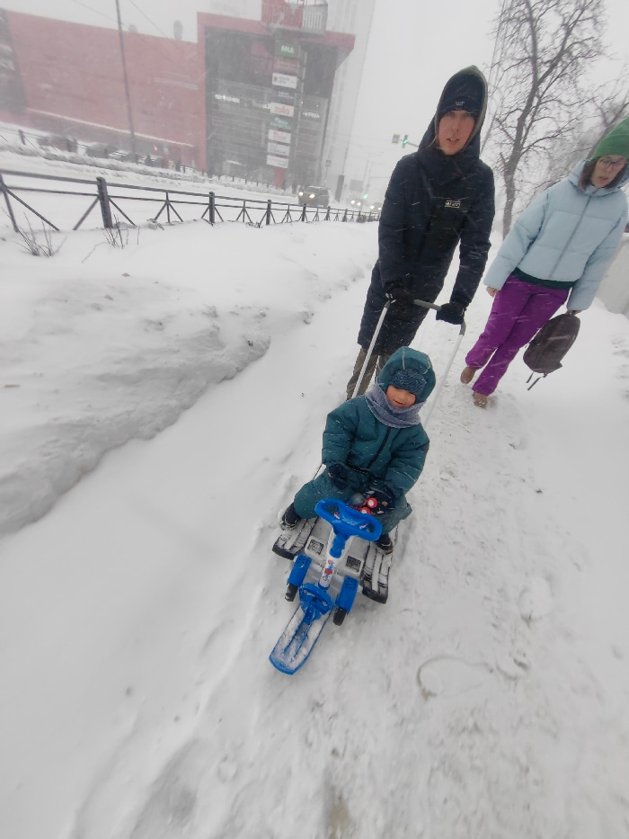 A family braves a snowy day. A young child sits on a blue snow scooter, being pulled by an adult in a black hooded coat. Beside them, another adult in a light blue puffer jacket and purple pants walks…read more