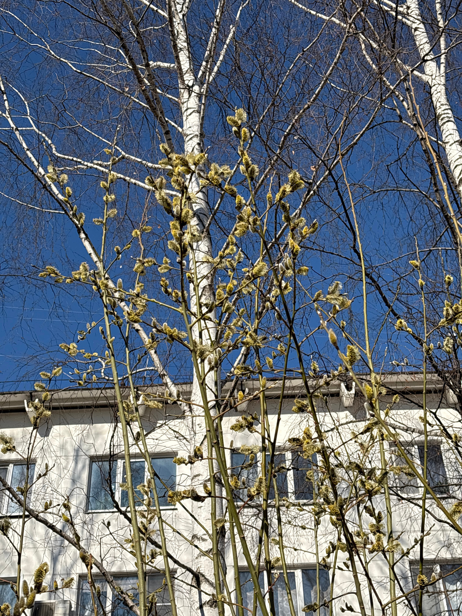 The image, taken in Chaikovsky, Russia, presents a view looking upwards towards a building with white walls and visible windows. The foreground features tree branches with emerging catkins, suggesting…read more