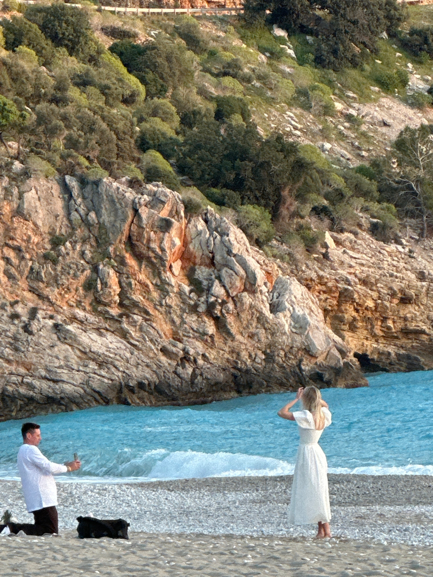The image captures a scenic view likely in or near Fethiye, Turkey, depicting a rocky cliff covered with trees on the left, meeting the turquoise water of the sea on the right. On the beach, a woman…read more