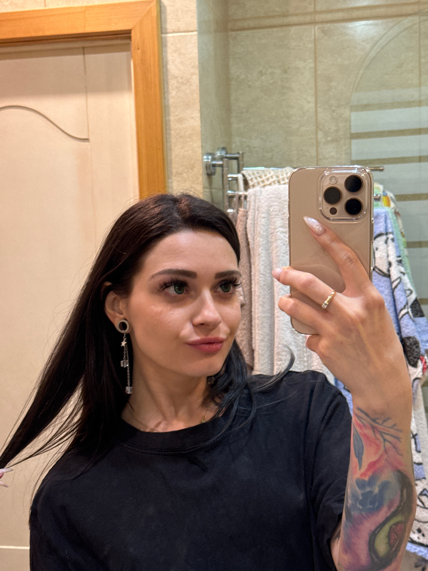 A woman with dark hair and green eyes is taking a selfie in what appears to be a bathroom. She is wearing a black t-shirt and earrings with star charms. She is holding a gold-colored iPhone with three…read more