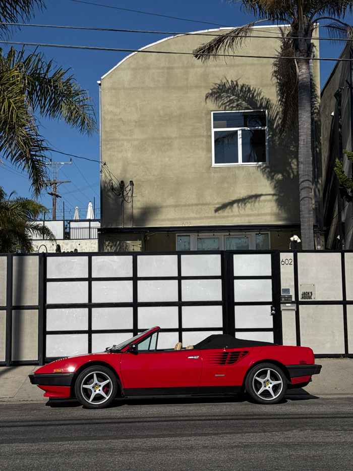 This image depicts a red convertible Ferrari Mondial parked on an asphalt street in Los Angeles, California, United States of America. The vehicle is positioned curb-side, parallel to a pedestrian sid…read more