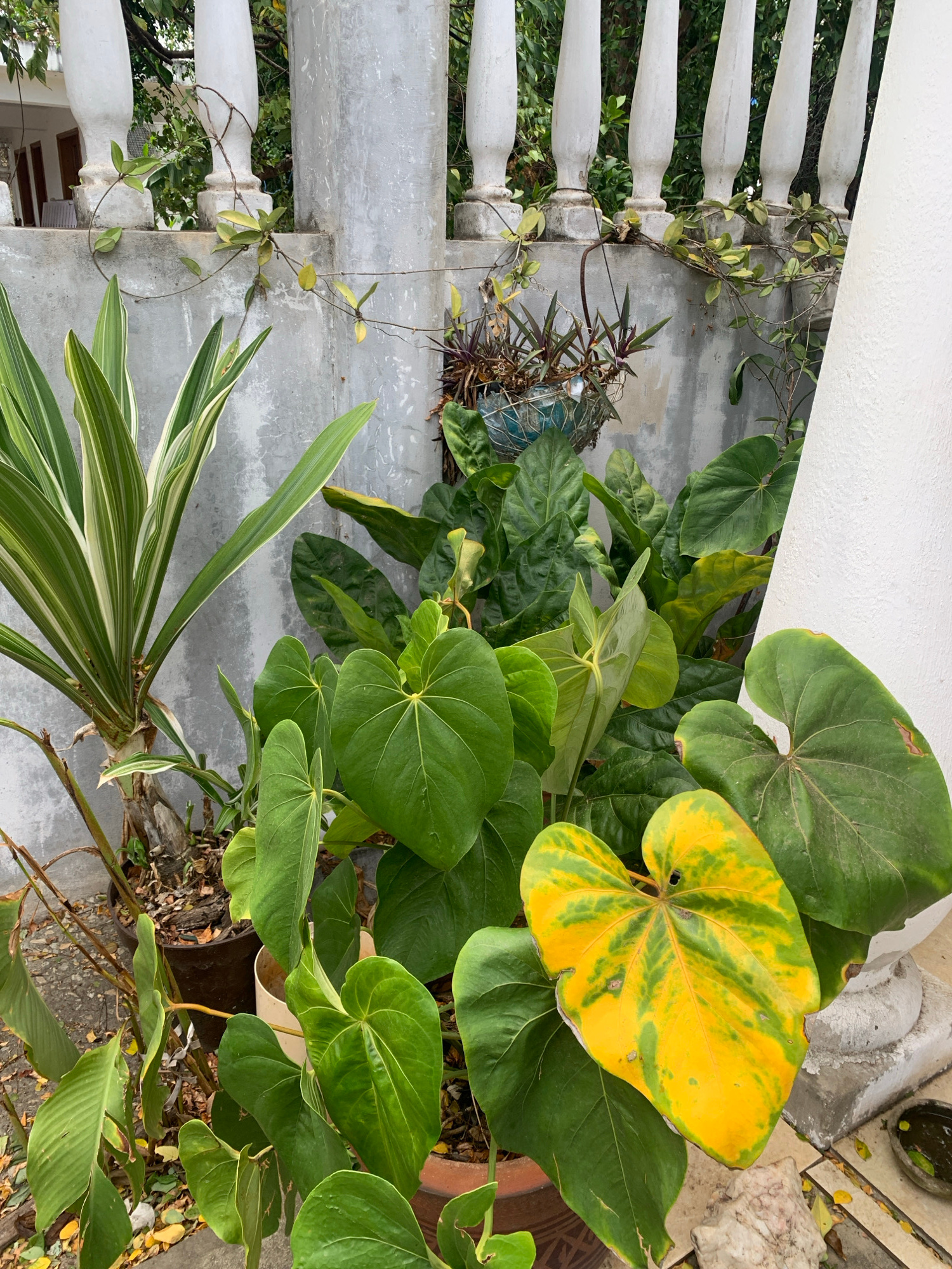 This image shows a collection of plants located next to a white balustrade and a concrete wall. A prominent plant in the center has large, heart-shaped leaves, with one leaf displaying a mottled yello…read more