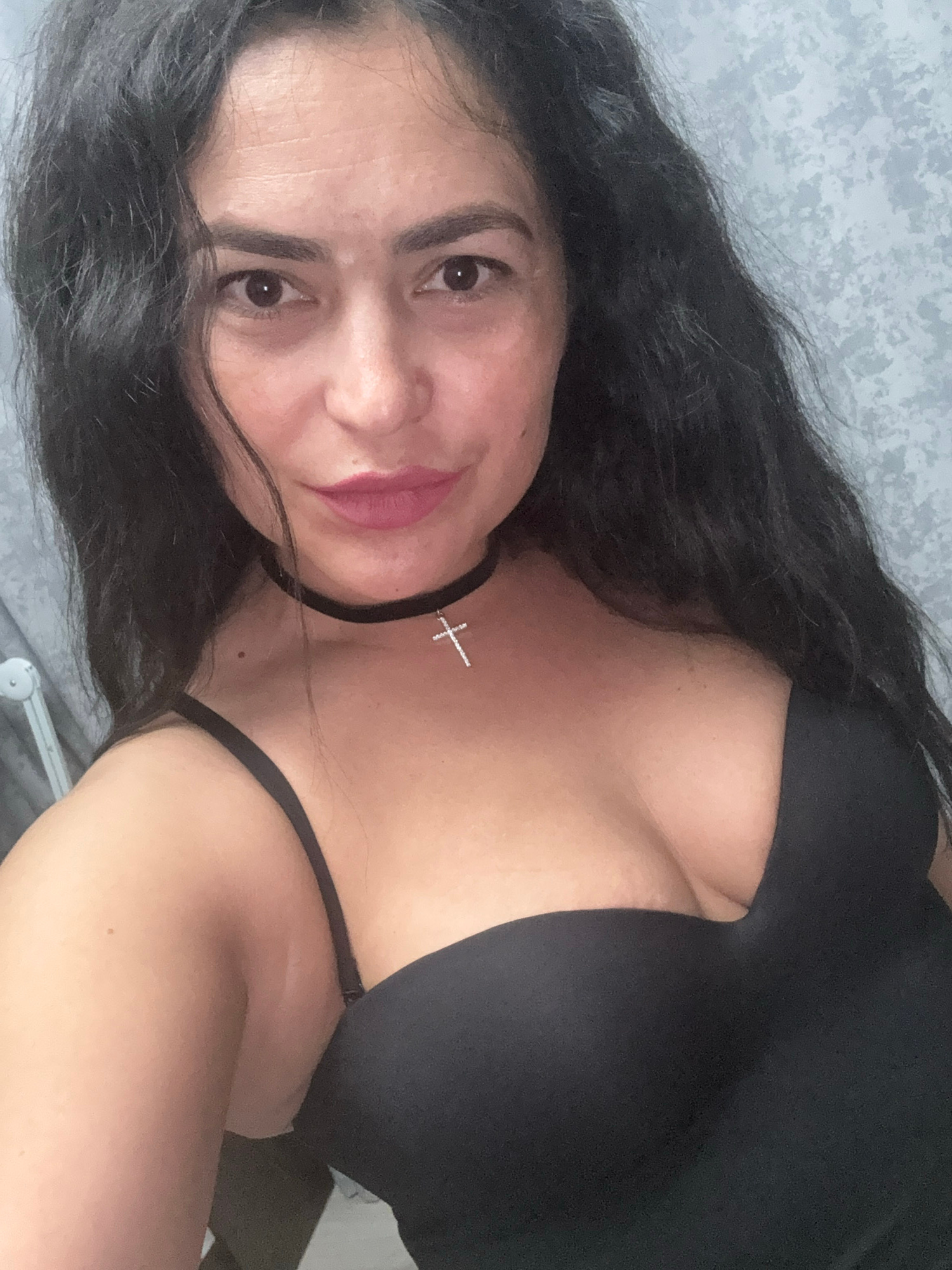 A woman with dark hair is shown in a selfie-style shot. She is wearing a black top and a black choker with a small silver cross pendant. Her facial features are visible, including her eyes, eyebrows,…read more