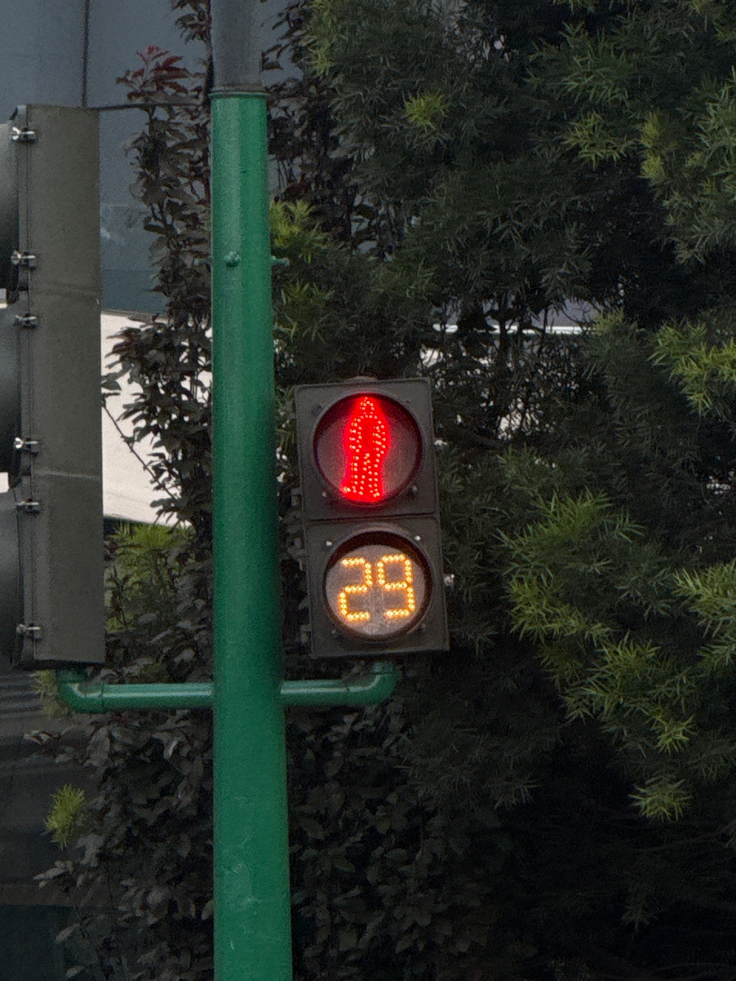 A pedestrian traffic signal in Mexico City, Mexico, displays a red walking figure alongside a countdown timer showing 62 seconds. The signal is attached to a green pipe. Behind the signal are dense gr…read more
