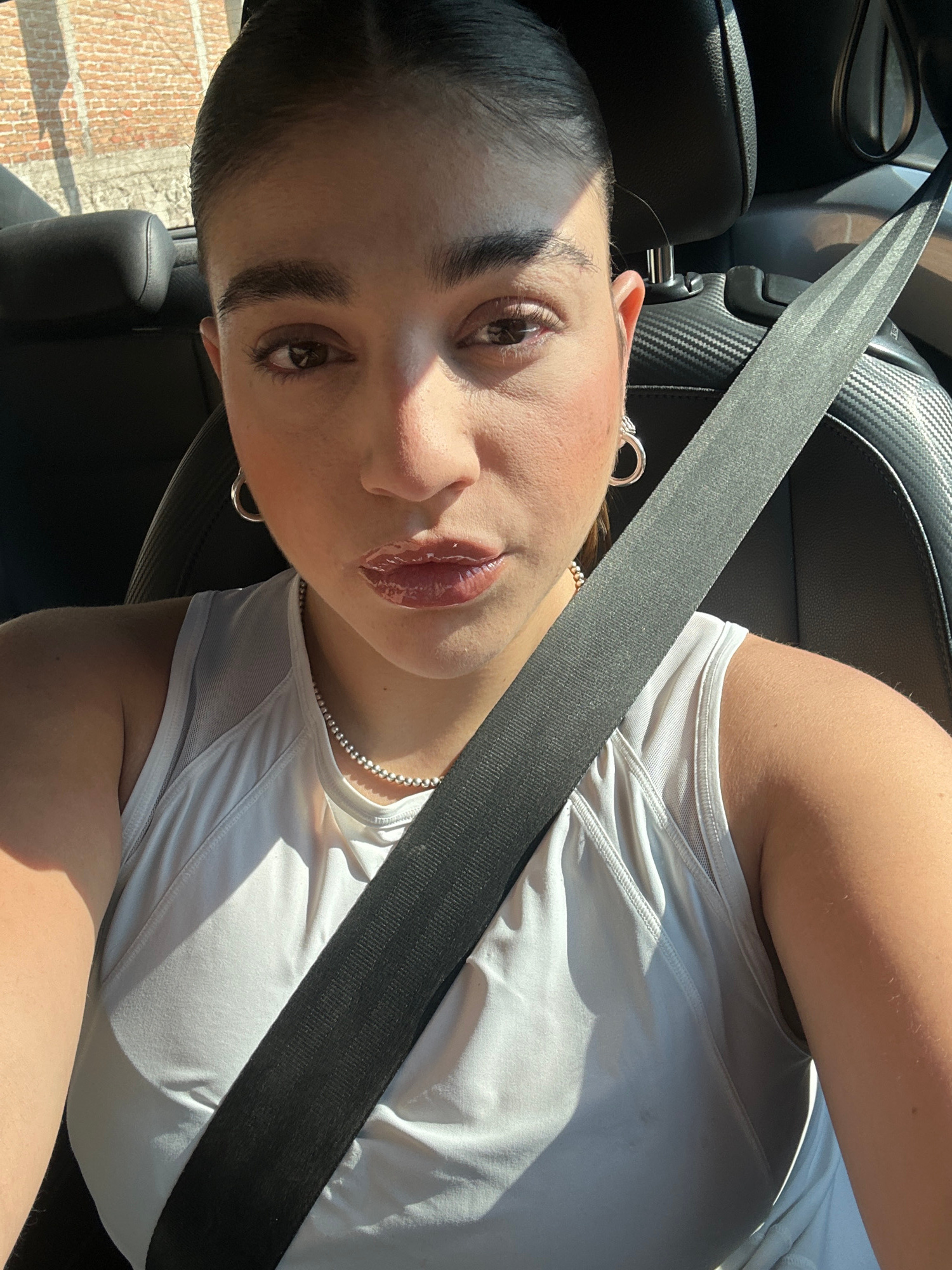A woman is sitting in a car, wearing a white tank top and a silver necklace. A seatbelt is fastened across her chest. She has brown hair pulled back, brown eyes, and is wearing lip gloss. She is looki…read more