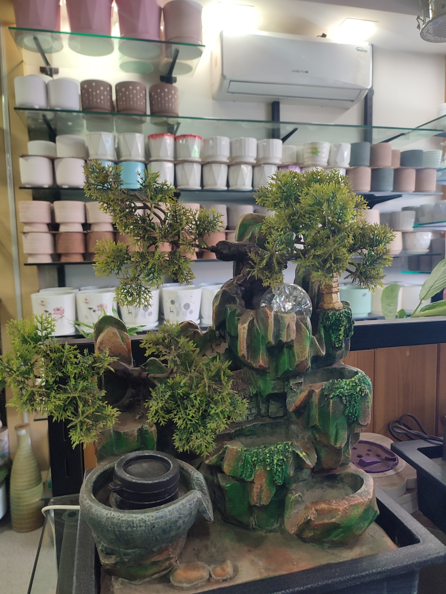 This image captures an indoor retail environment, likely a plant nursery or home decor store, situated in Ernakulam, India. The primary subject is a multi-tiered tabletop water fountain, designed to m…read more