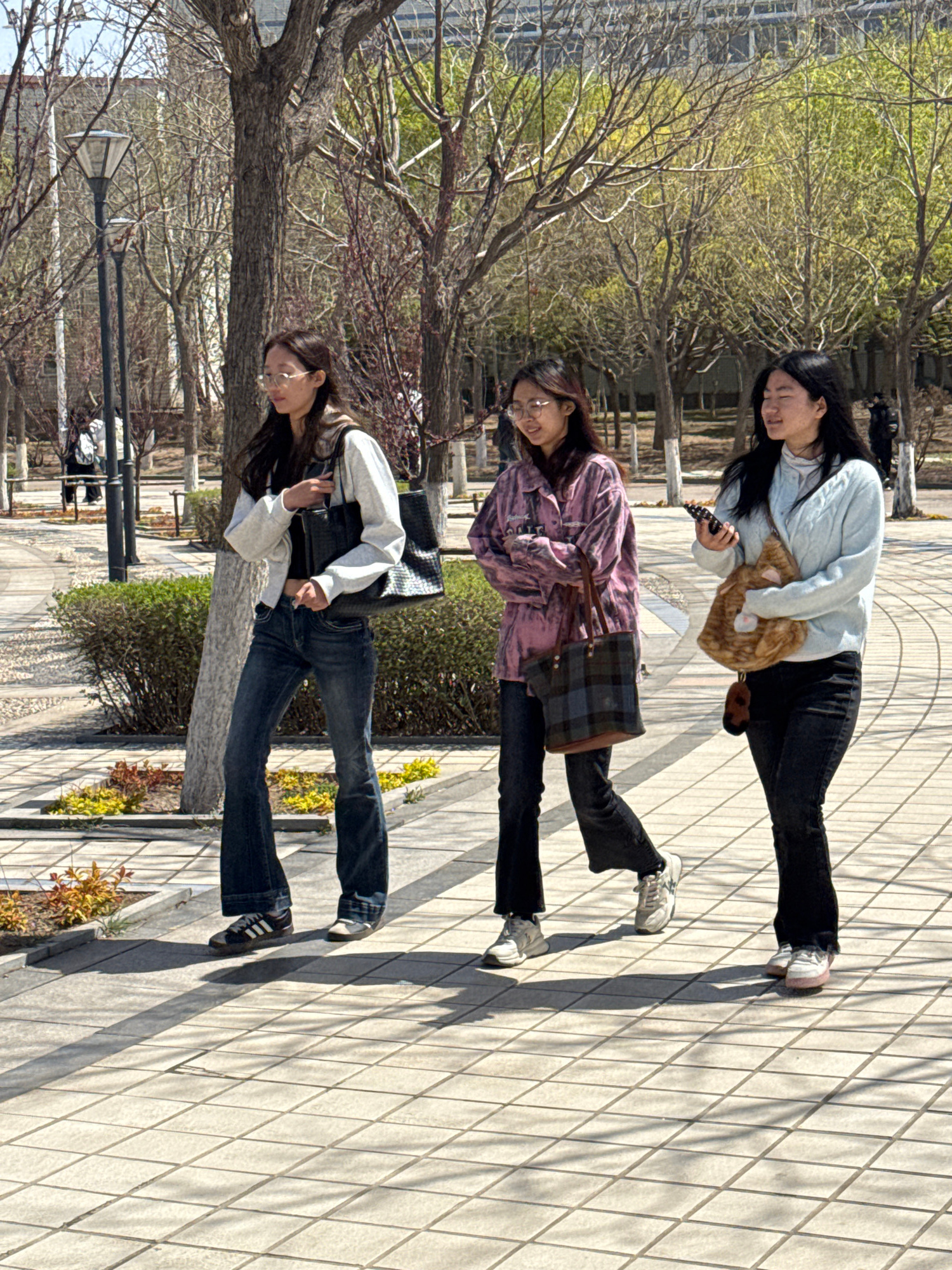 Three women are walking on a paved area alongside trees, likely within an urban park in Guta, China. The woman closest to the viewer is wearing jeans, a white sweatshirt, and a black vest, with black…read more