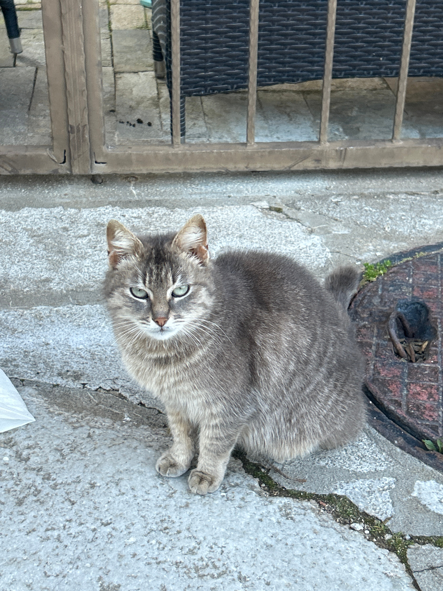 A gray tabby cat with green eyes lies on a gray concrete surface near a metal grate. The location appears to be outdoors, possibly a courtyard or sidewalk. In the background, a metal grate is visible.…read more