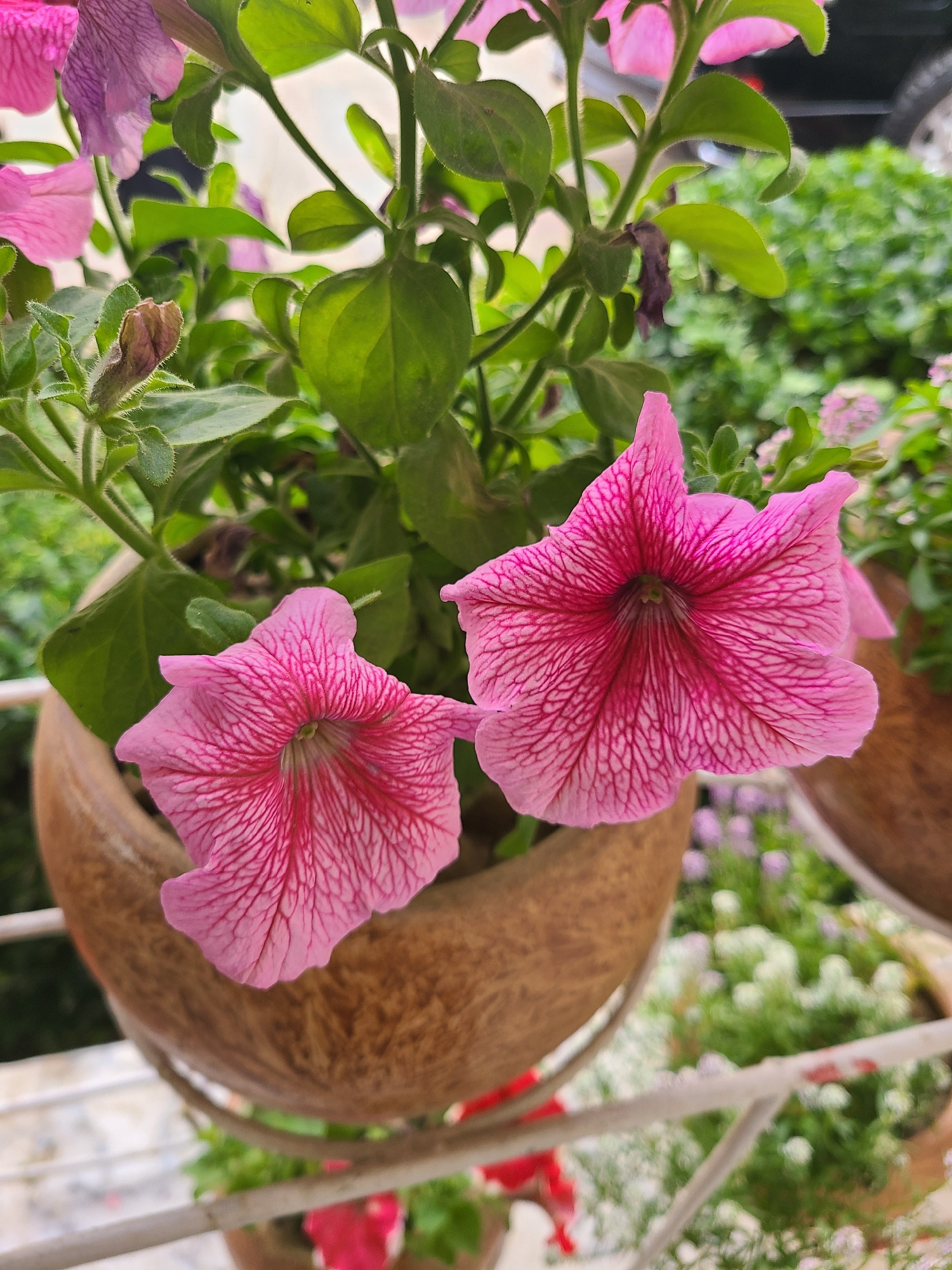 A close-up photograph shows two pink petunia flowers with dark pink veins in a hanging brown coconut husk planter. The flowers are surrounded by green leaves and stems. The background includes other p…read more