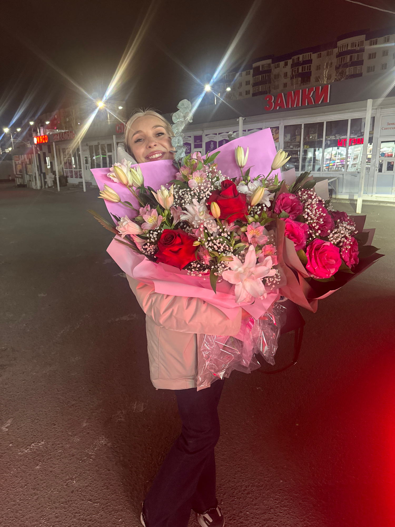 The image shows a woman holding two bouquets of flowers outdoors at night. She is smiling at the camera, with bright lights behind her. The larger bouquet has red and white roses and lilies wrapped in…read more