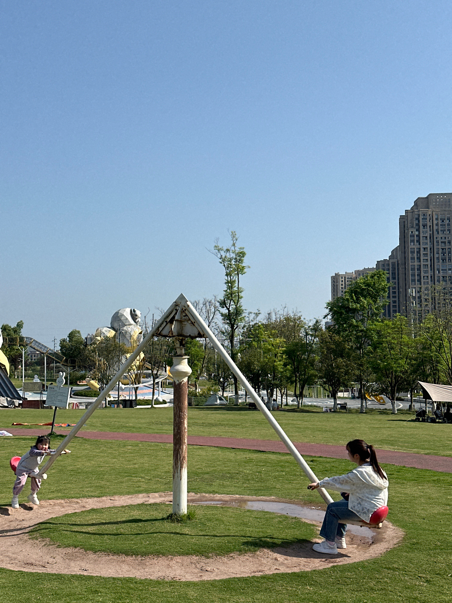 This image depicts a sunny daytime scene in a park or playground in Jiangjin, China, under a clear, bright blue sky. The foreground and mid-ground are dominated by a large area of neatly mown green gr…read more