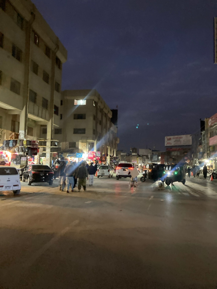 The image depicts a nighttime street scene in Quetta City Tehsil, Pakistan, under a dark, cloudy sky. The environment is urban and commercial, illuminated primarily by artificial light sources. On th…read more