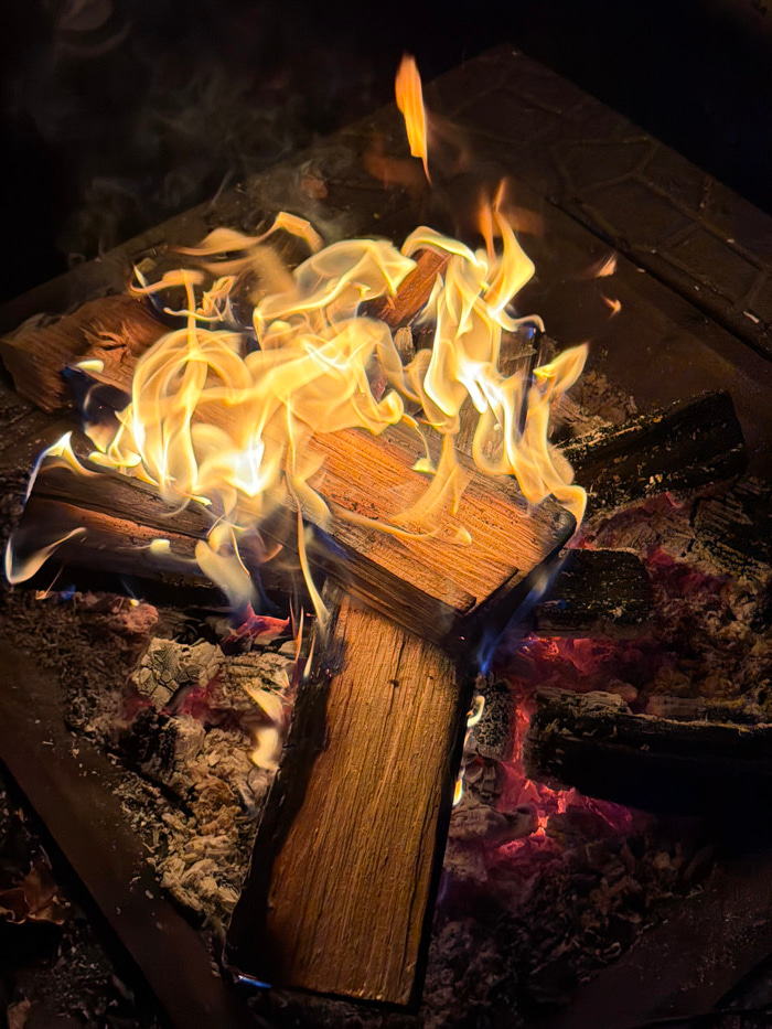 A high-angle photograph depicts an active wood fire contained within a dark, possibly metallic, fire pit or grate structure. The scene is located in Huixquilucan de Degollado, Mexico, under dark condiβ¦read more