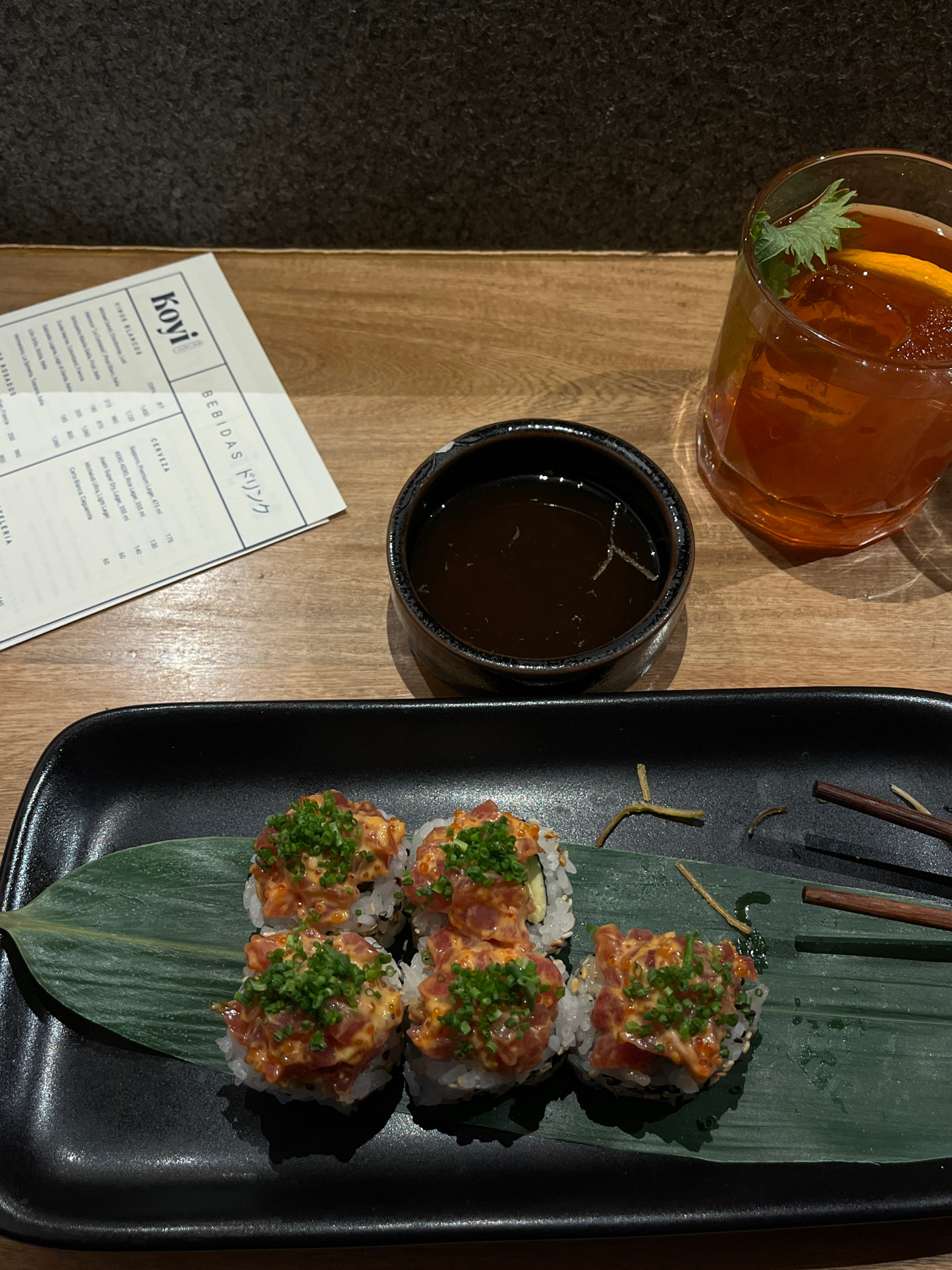 The image shows a restaurant table, likely in Mexico City, Mexico, as indicated by the restaurant name "Koyi" on the menu and the "Bebidas" heading in Spanish and Japanese, a cocktail with an orange s…read more