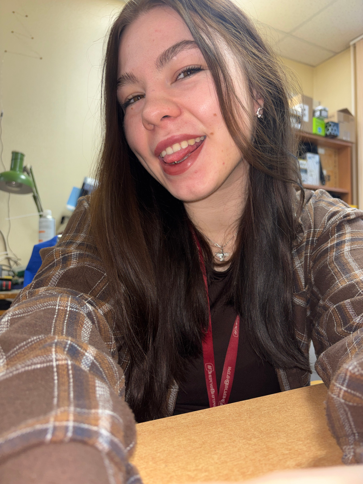 A young woman is taking a selfie, sticking out her tongue, with a table in the foreground. The woman has long brown hair, wears a brown plaid shirt and a dark brown top. She has a tongue piercing and…read more