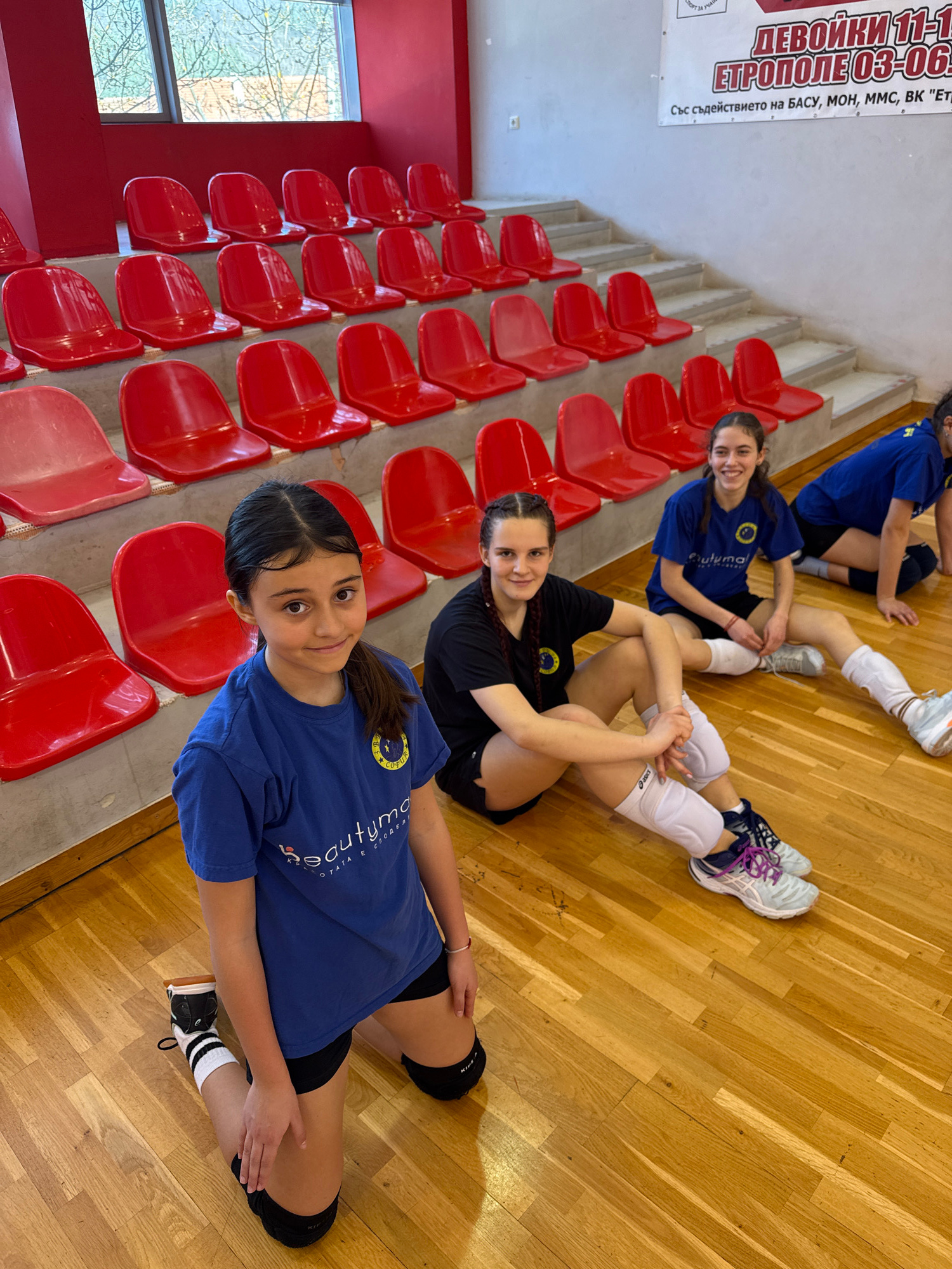 A group of four young female volleyball players are resting on the floor of a gymnasium in Etropole, Bulgaria. They are positioned near the bleacher seats. The players are wearing volleyball uniforms…read more