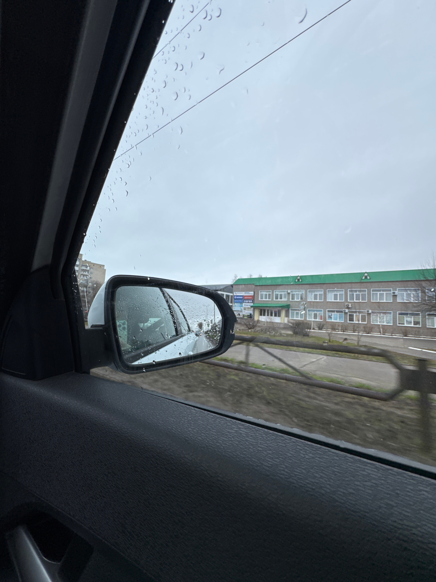 The image, taken from inside a car on a rainy day, shows a view of a city street reflected in the car's side mirror. The sky is overcast and the car's window is covered in raindrops. In the mirror's r…read more